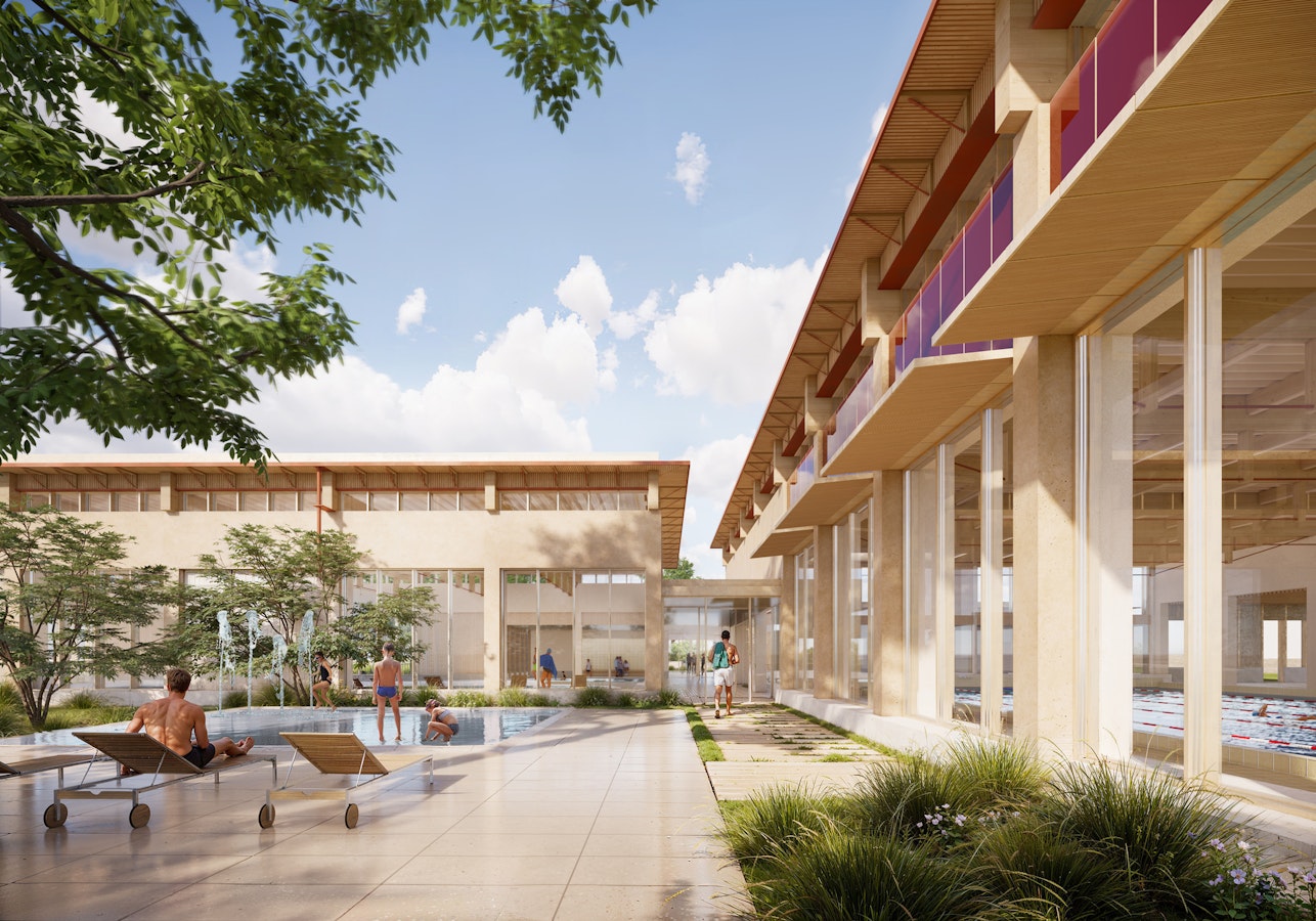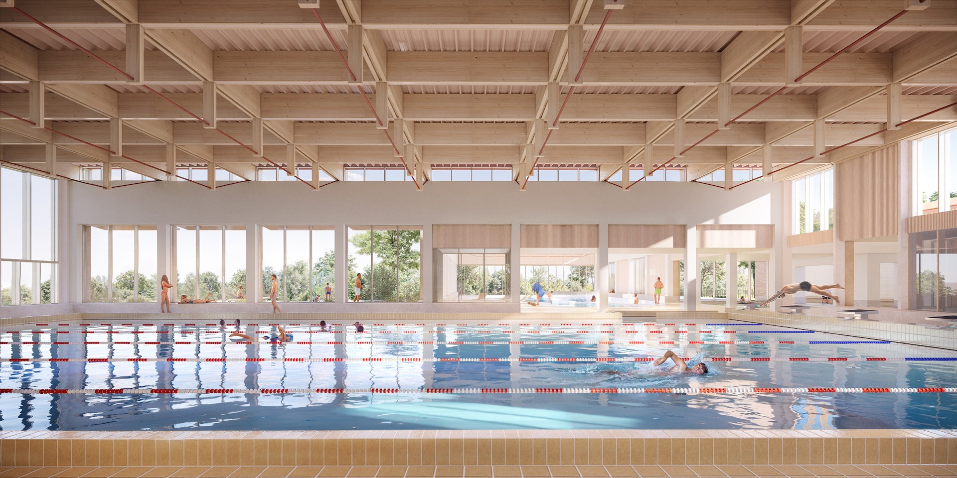 L’ensemble est articulé par l’accueil, grande place intérieure centrale qui s’installe légèrement en retrait du parvis, au cœur du projet, et permet de relier l’ensemble des espaces en optimisant les flux. Dès l’entrée, il dévoile une vue privilégiée sur les bassins et le paysage, inscrivant l’usager dans une expérience sensible dès les premiers pas.