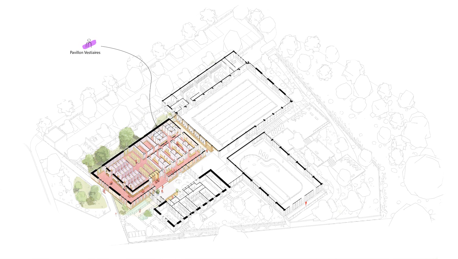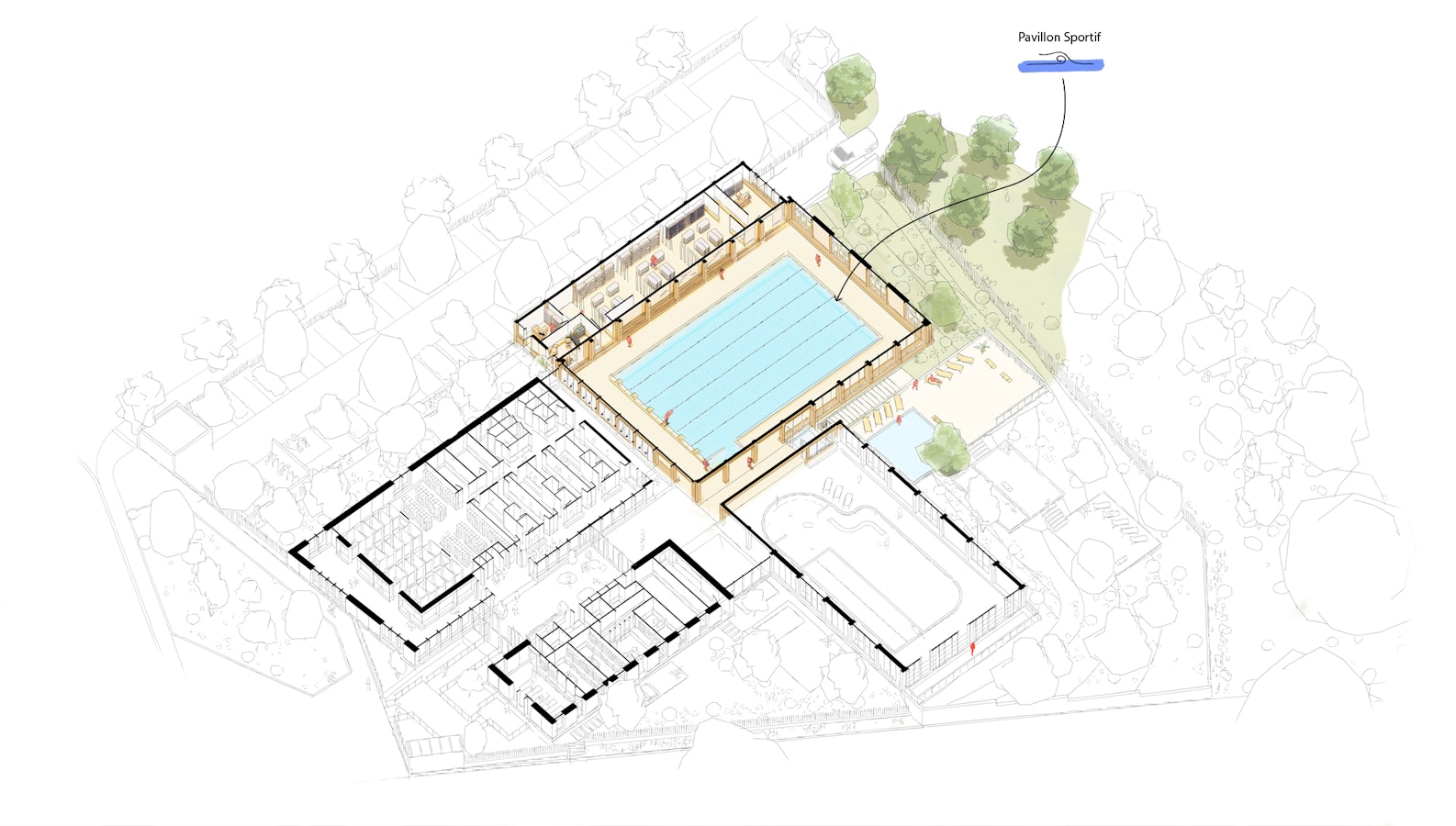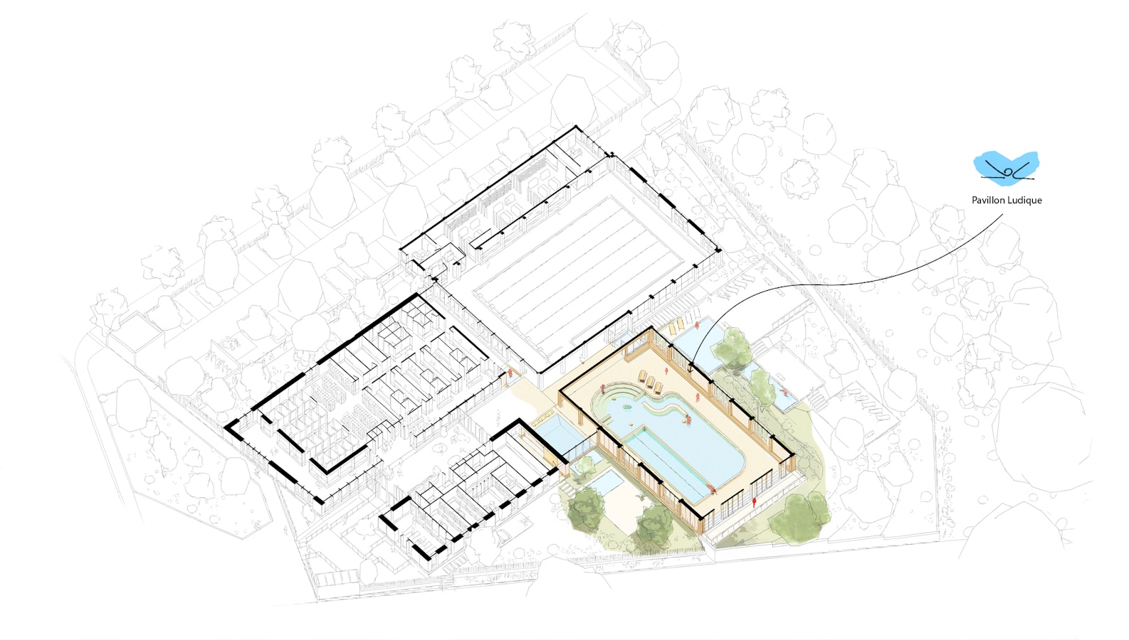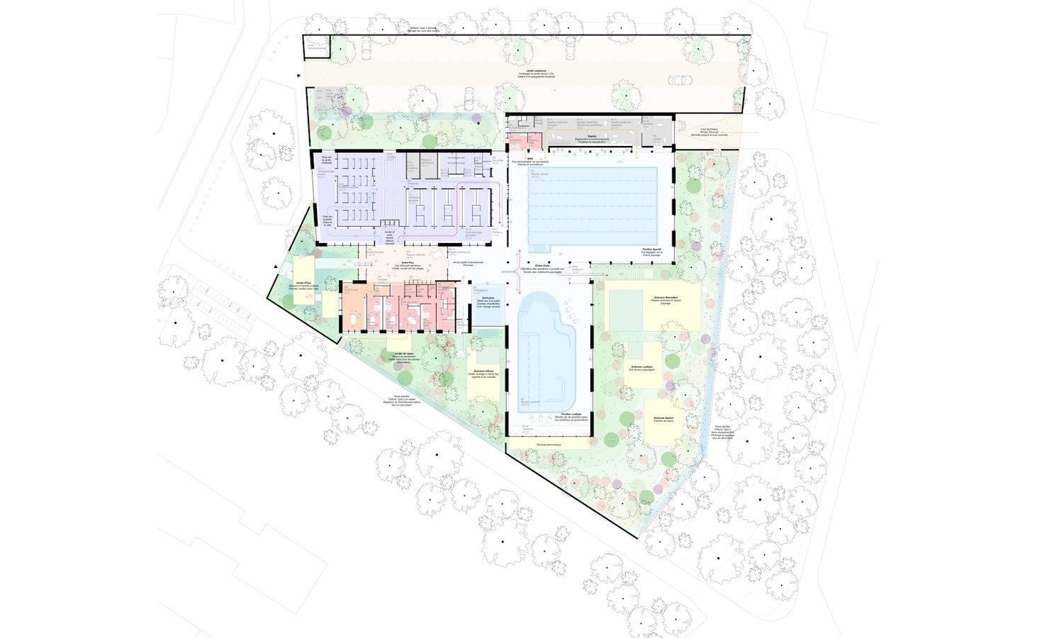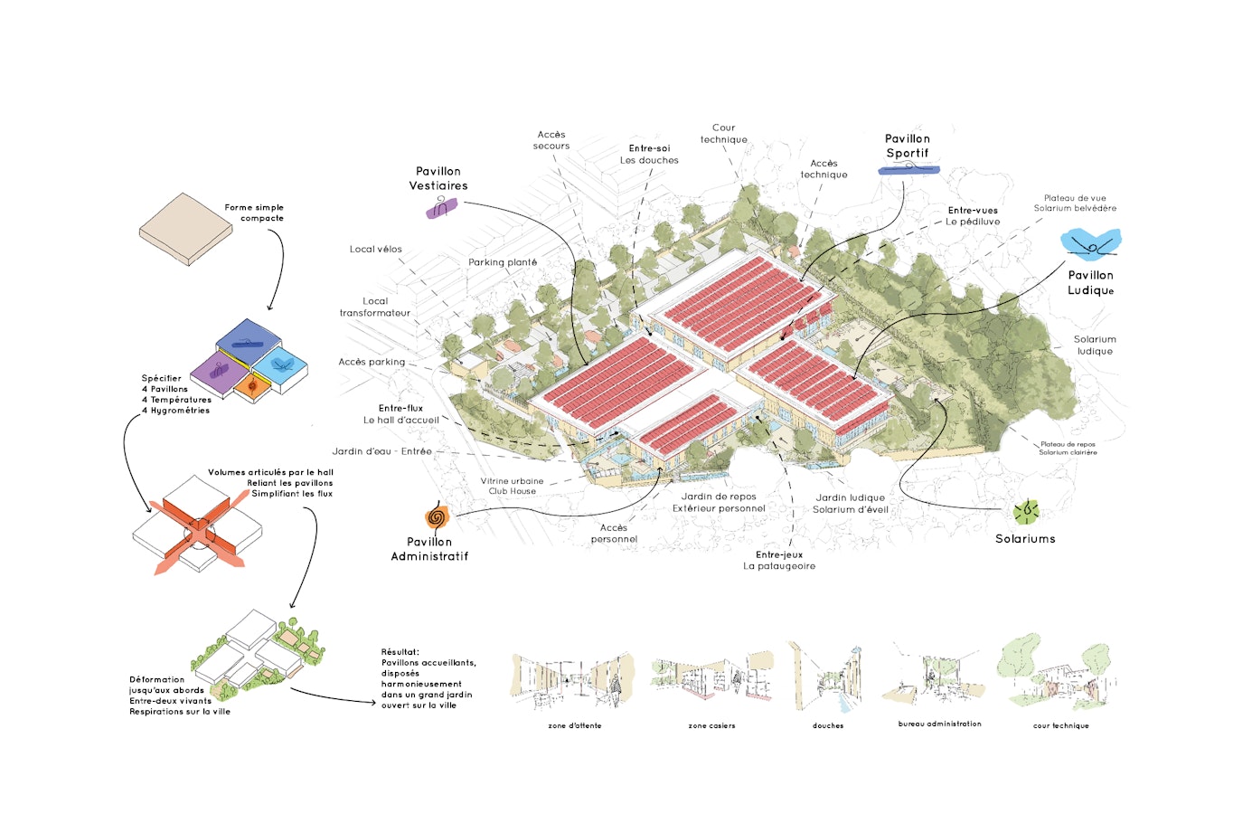 Par l’implantation de ces pavillons entre eux et leur géométrie propres se dessinent de multiples jardins thématiques, structurant les abords et offrant de grandes respirations végétales à l’espace urbain, tout en préservant l’intimité des nageurs.
