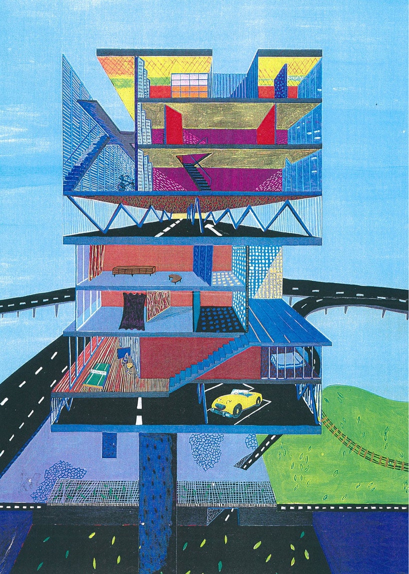 Nous avons imaginé un immeuble complexe, fait de plots au sol, et d'un immeuble tendu décolé du sol , lui même surmontée d'immeubles en plots orientés sur des horizons divers.
