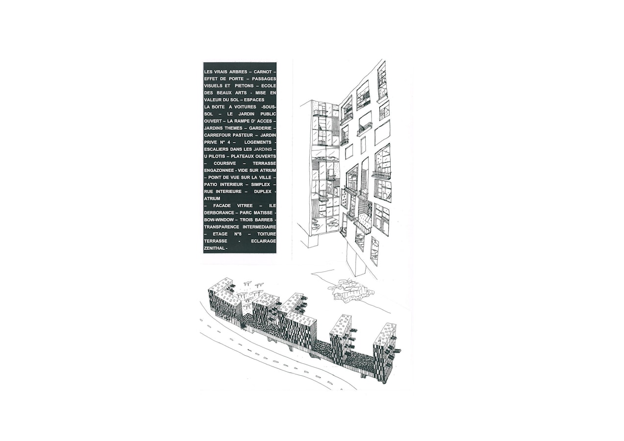 La "barre carnot" est née d'une nécessité de financement du Parc Matisse d'Euralille à un moment de grande tension financière. L'immeuble projeté, sous forme de tour, puis de barre questionne le rapport de la fin de la ville, zone incertaine, périphérique.. et la lisière d'un parc en devenir le long d'un boulevard qu'il fallait rendre éminemment urbain.