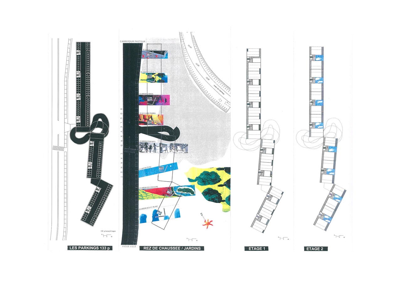 Ce décollement permet de lier le boulevard au parc comme une grande fenêtre horizontale et de laisser visible les vestiges des demie-lune, fortification avancée de Lille au 17ème siècle. Ce sous-sol historique inviolable nous a conduit d'ailleurs à réaliser un parking en superstructure courant d'un bout à l'autre sur différents niveaux et permettant le stationnement au plus près de chaque appartements.