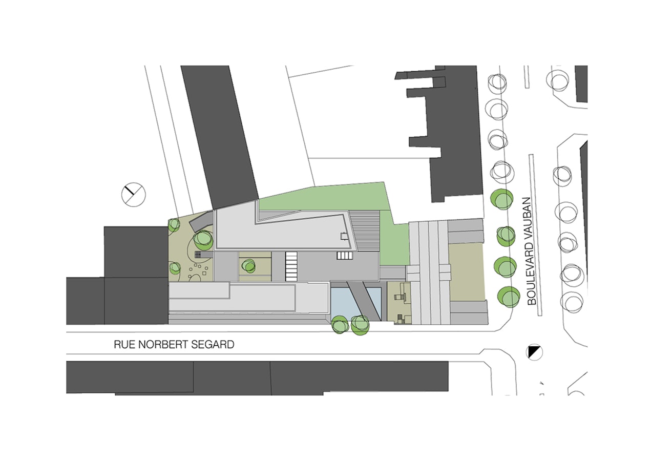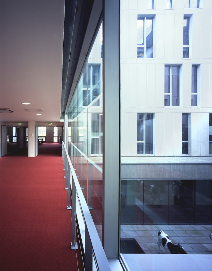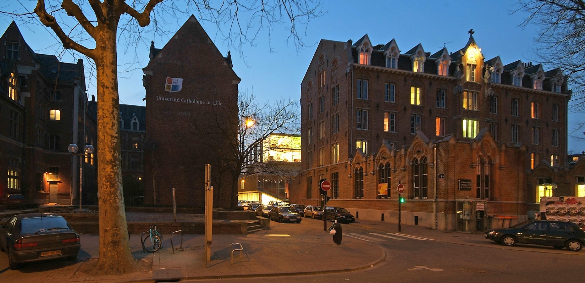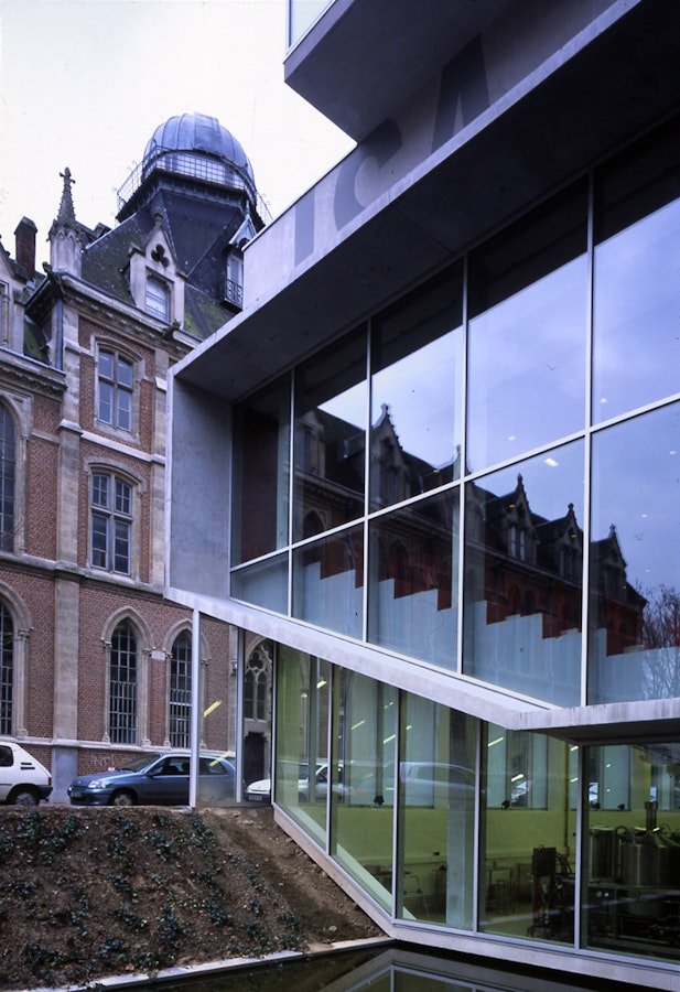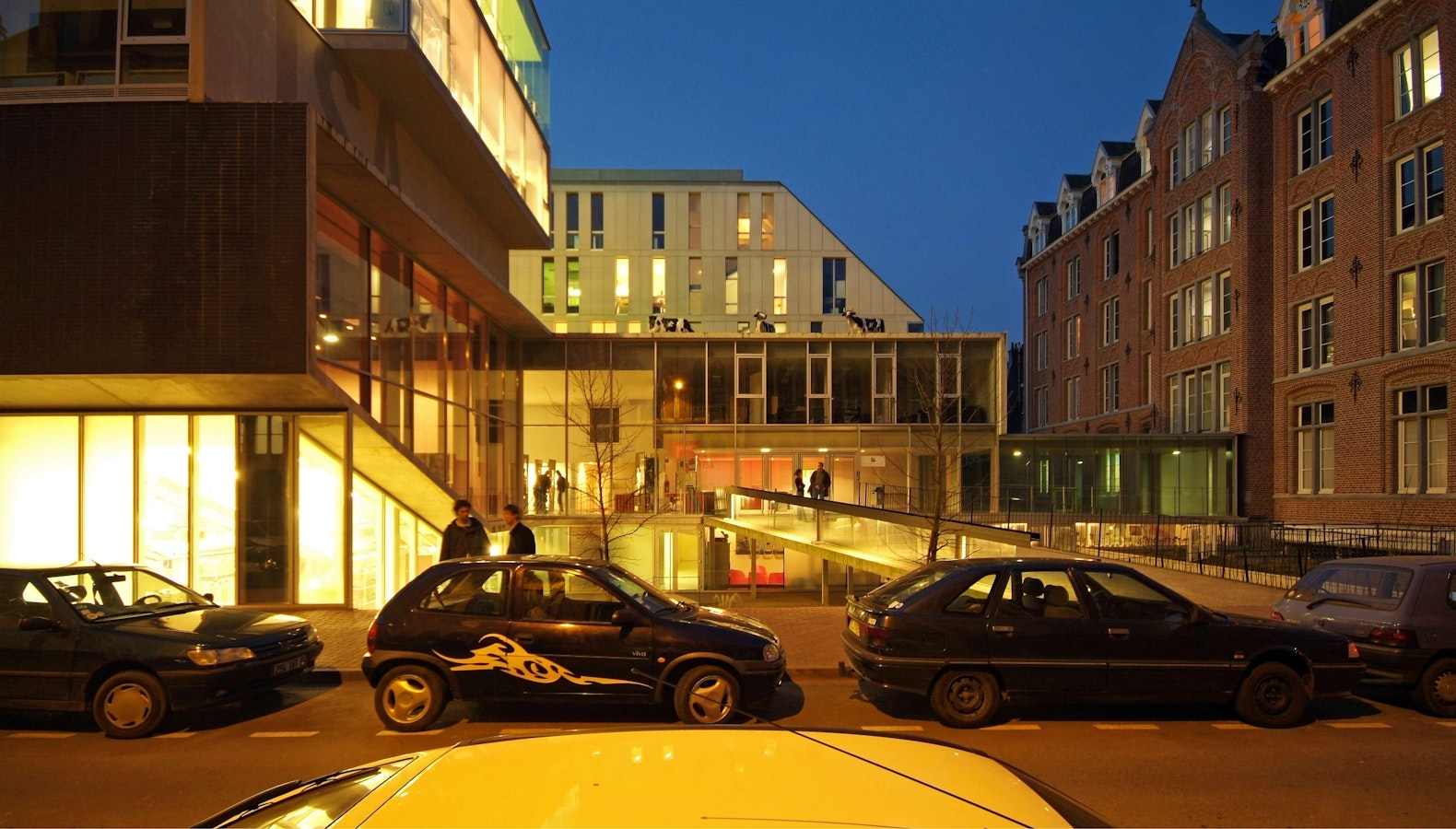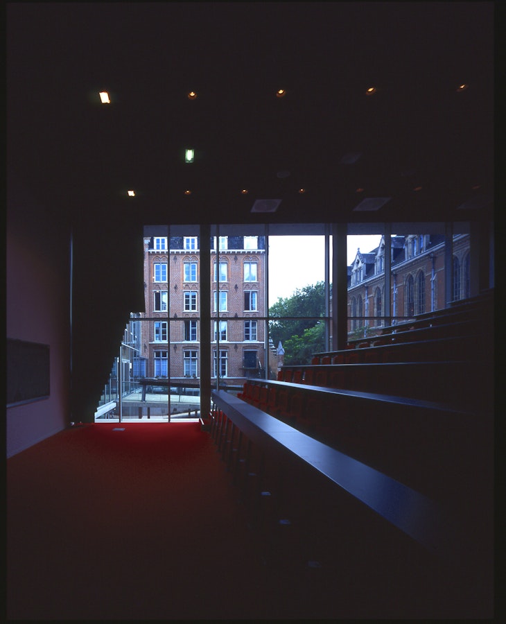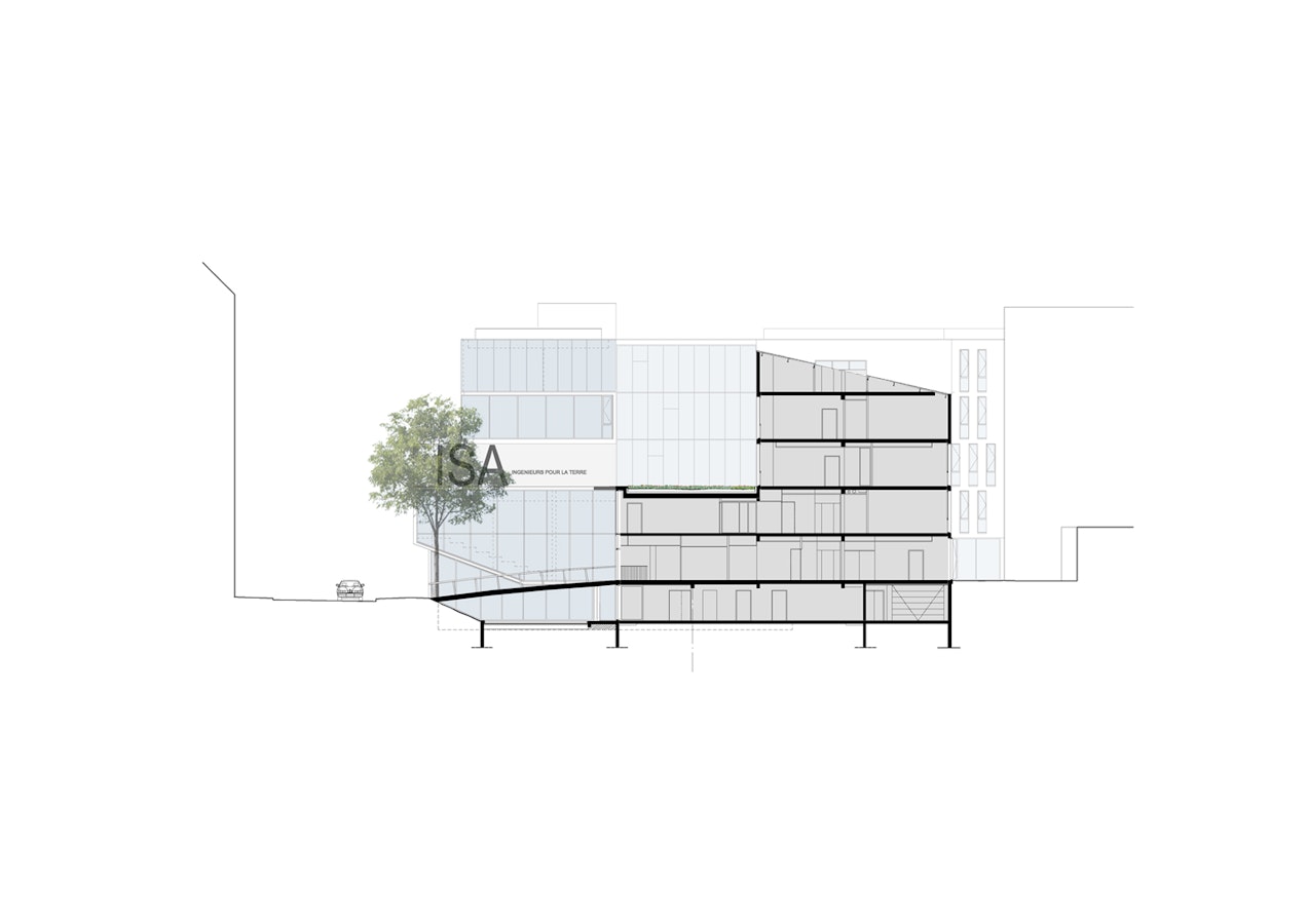 Lieu ouvert et transparent, le bâtiment apparaît autour d’une «scène de théâtre», visible depuis le boulevard Vauban, où conversent avec lui les bâtiments Néogothiques «Historiques» de la Catho autour du nouveau jardin d’eau que franchit la passerelle d’accueil.