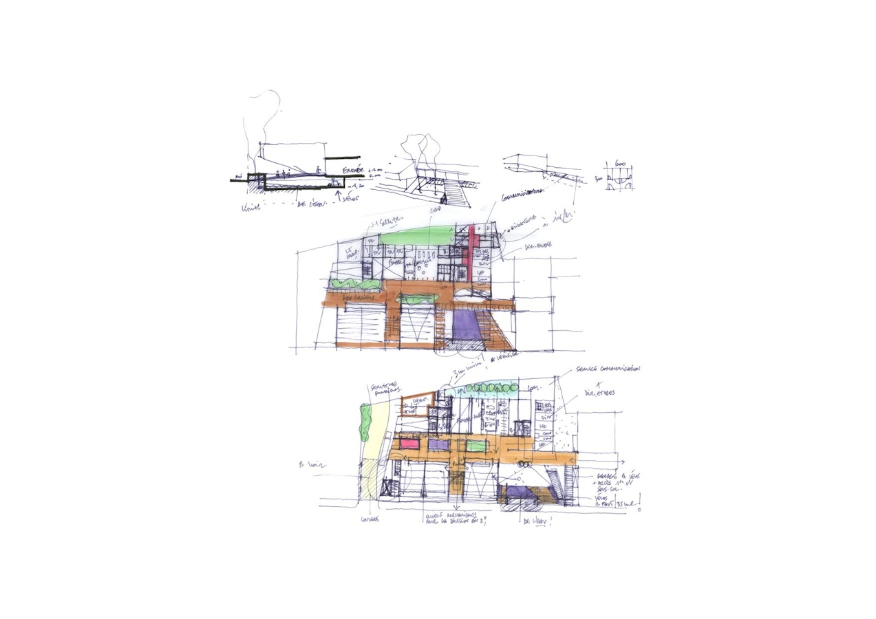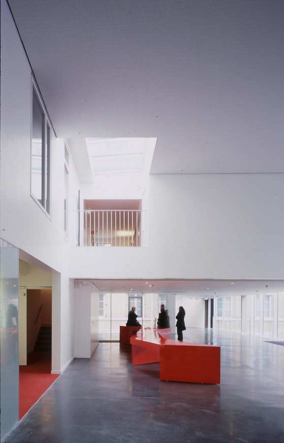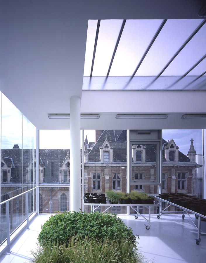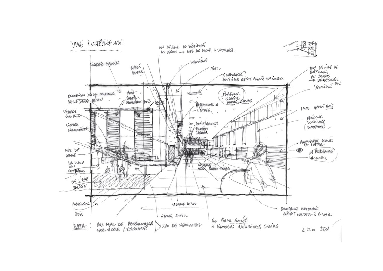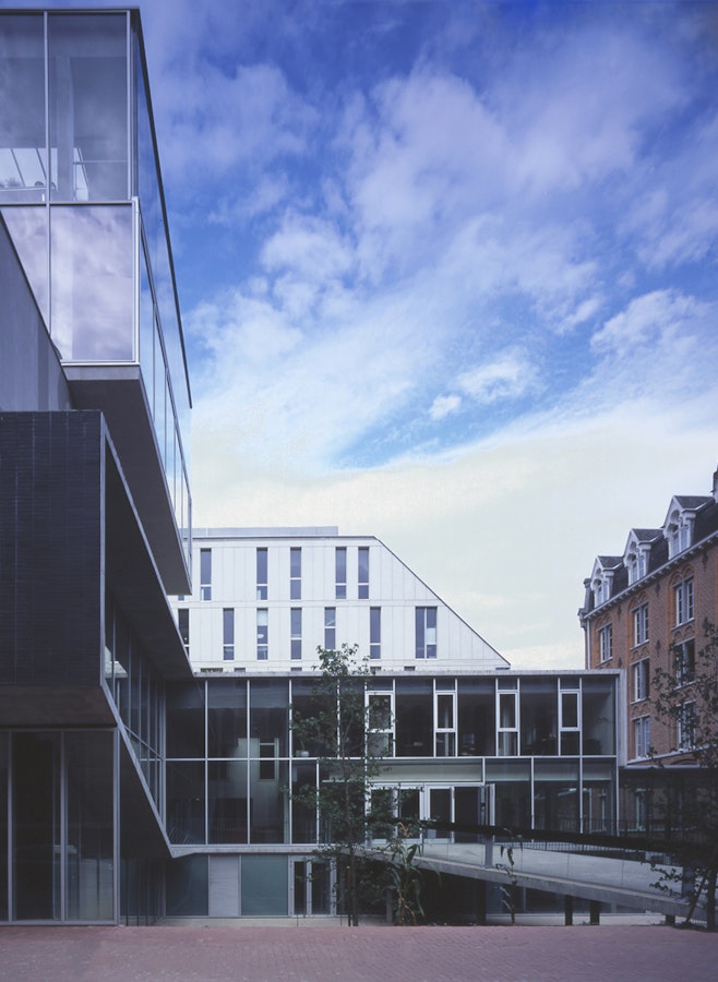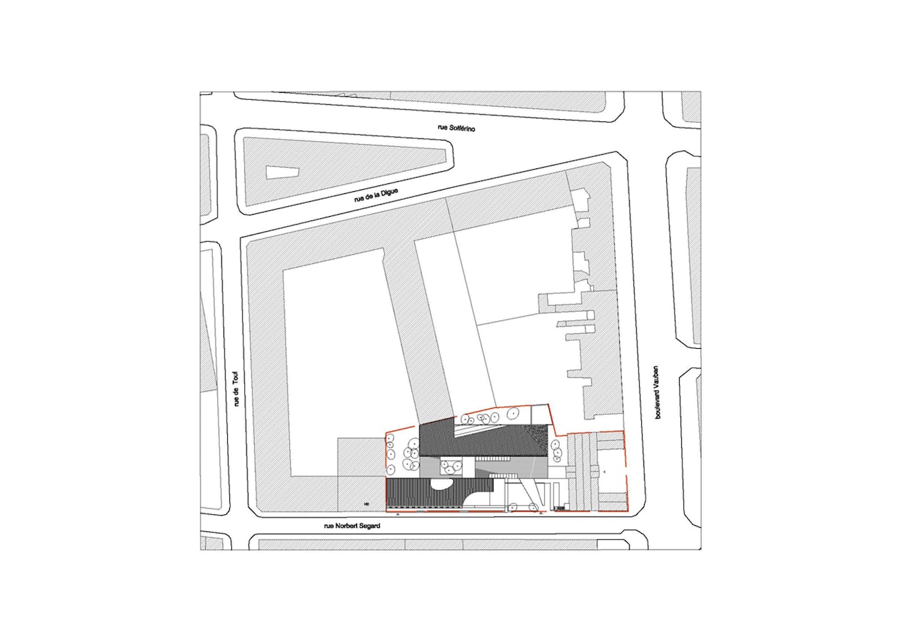Lieu ouvert et transparent, le bâtiment apparaît autour d’une «scène de théâtre», visible depuis le boulevard Vauban, où conversent avec lui les bâtiments Néogothiques «Historiques» de la Catho autour du nouveau jardin d’eau que franchit la passerelle d’accueil.