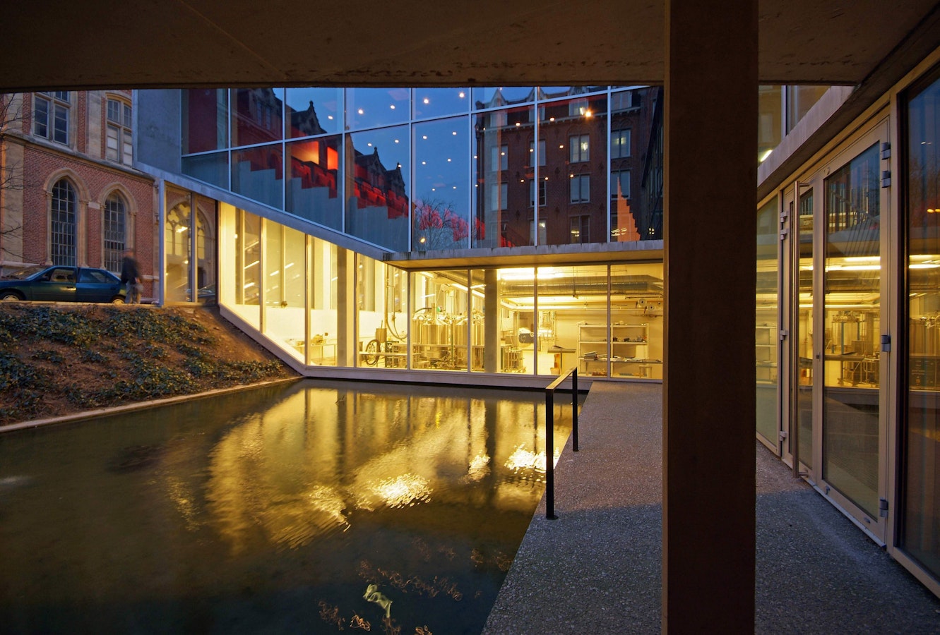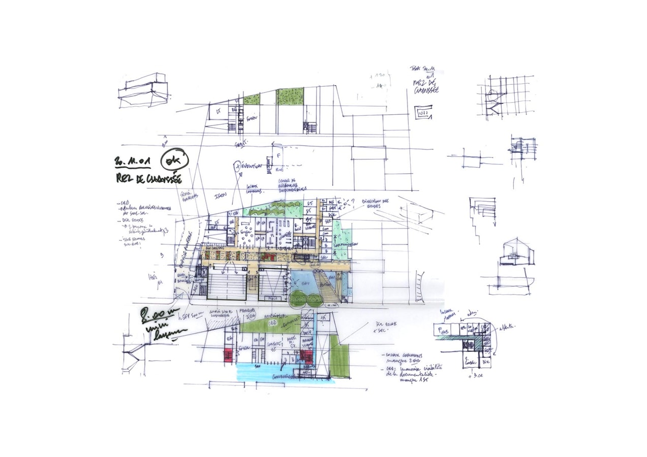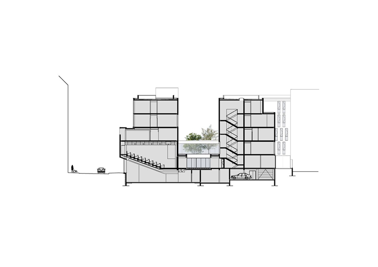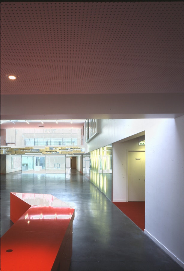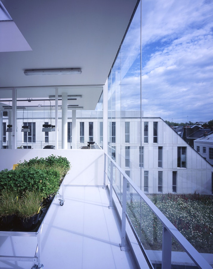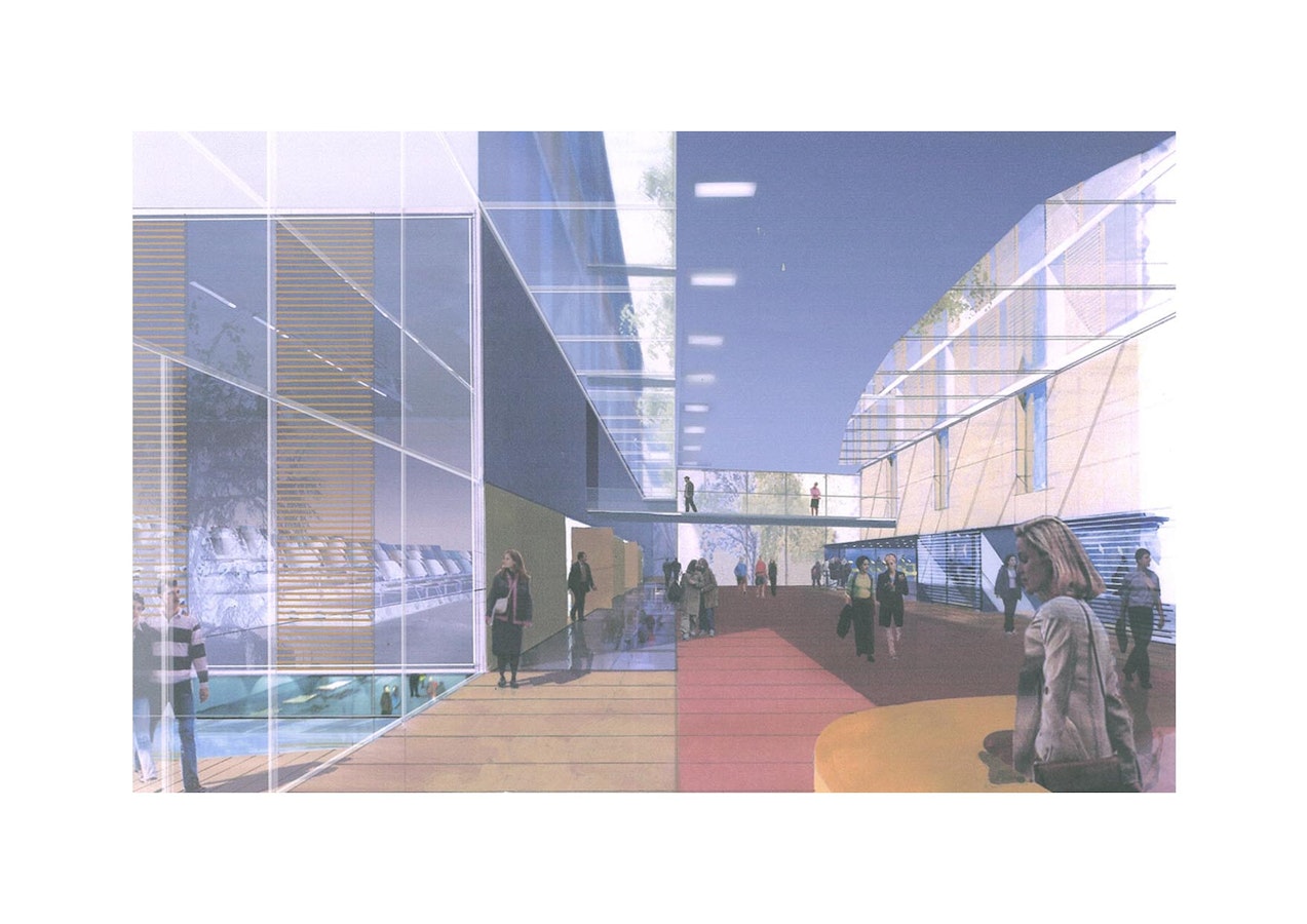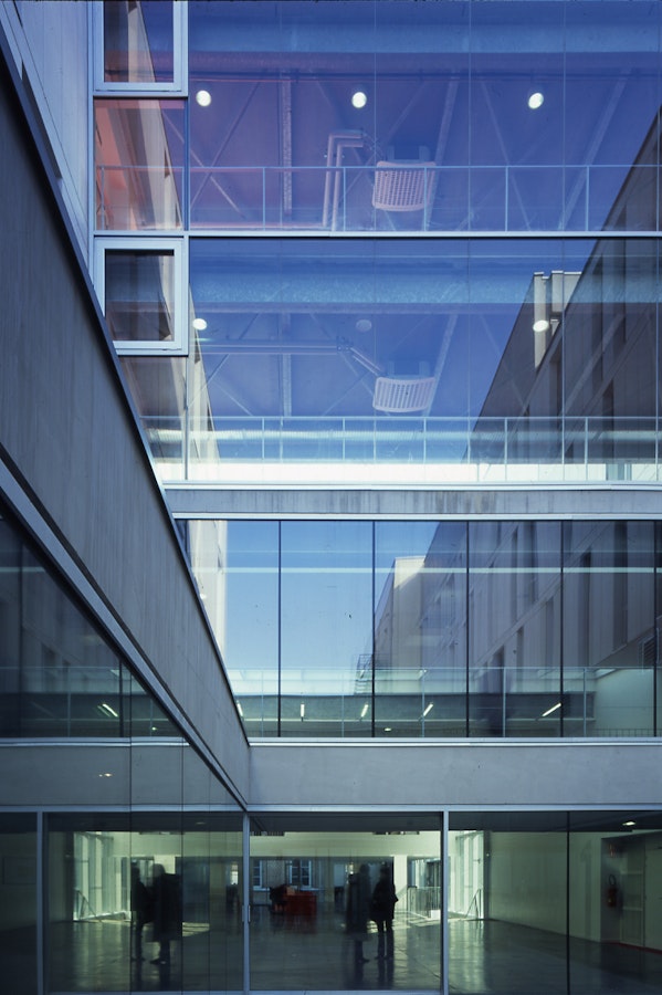 Lieu ouvert et transparent, le bâtiment apparaît autour d’une «scène de théâtre», visible depuis le boulevard Vauban, où conversent avec lui les bâtiments Néogothiques «Historiques» de la Catho autour du nouveau jardin d’eau que franchit la passerelle d’accueil.