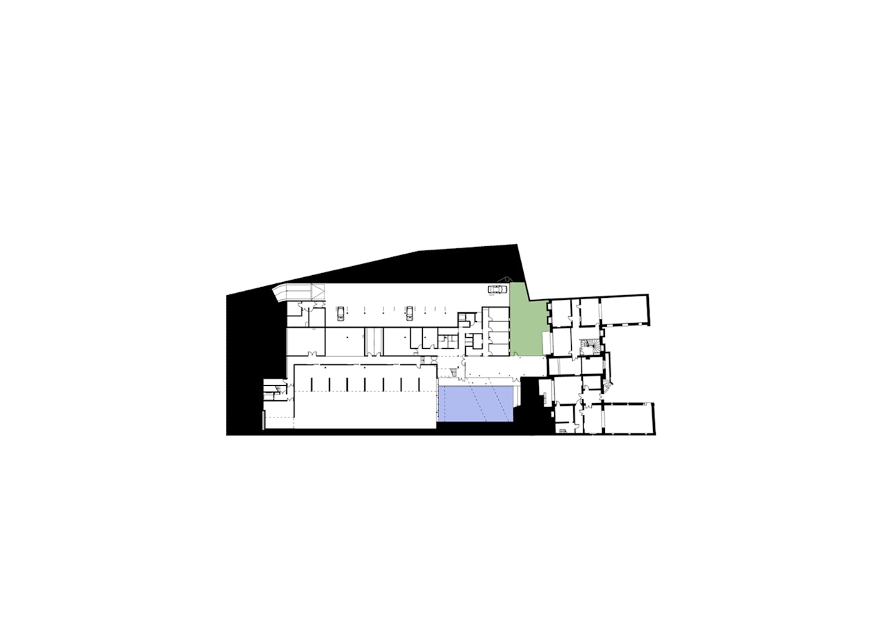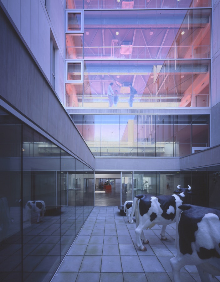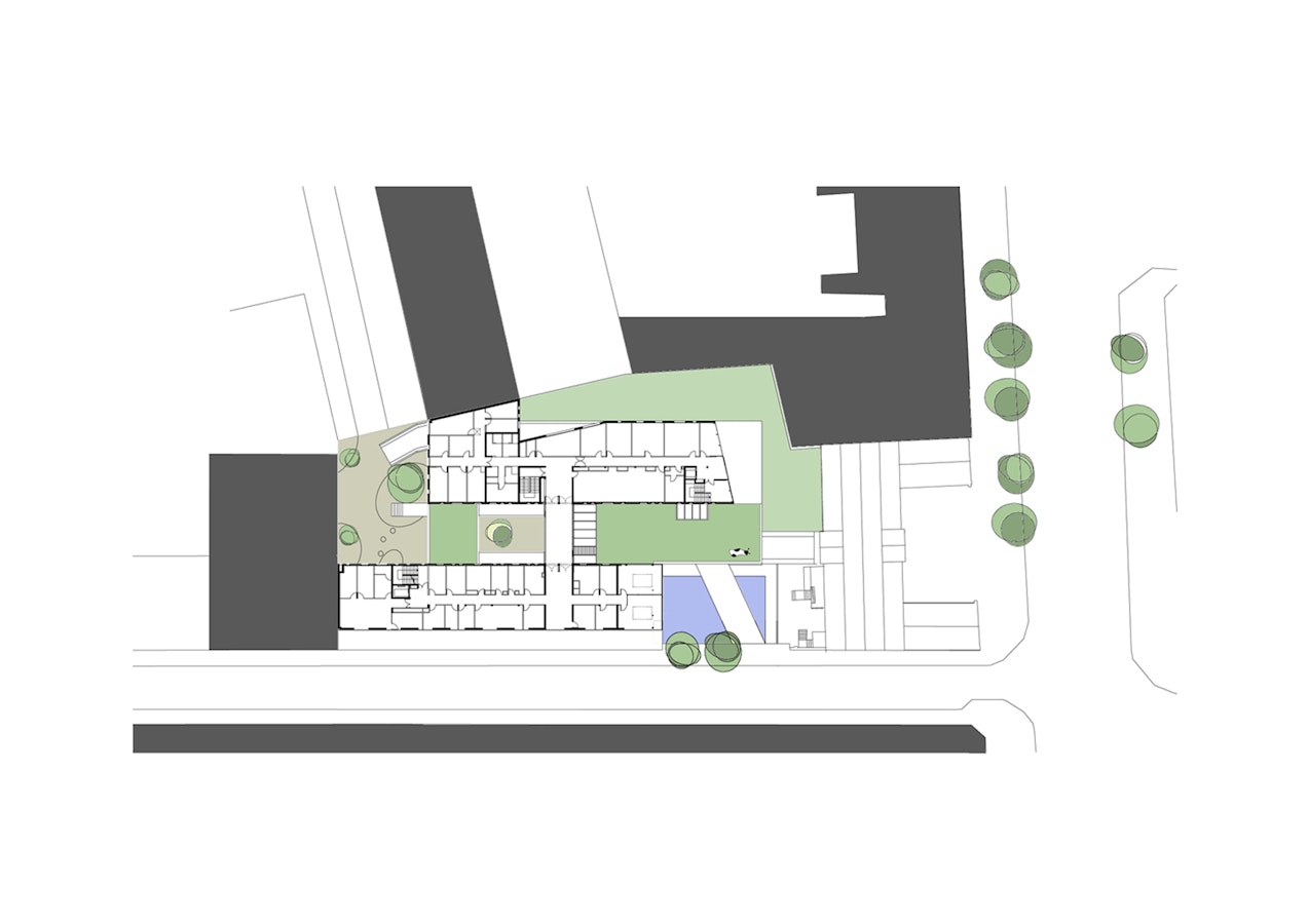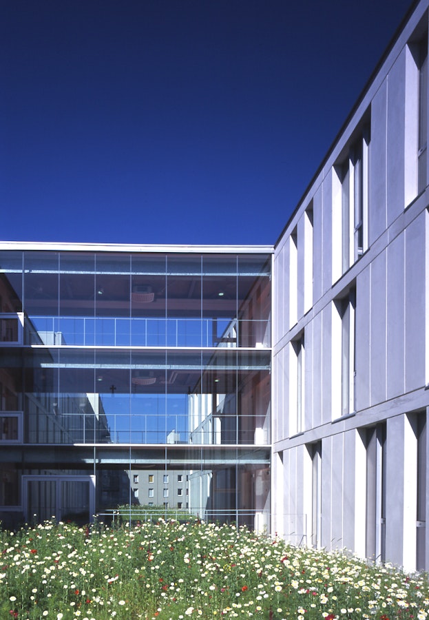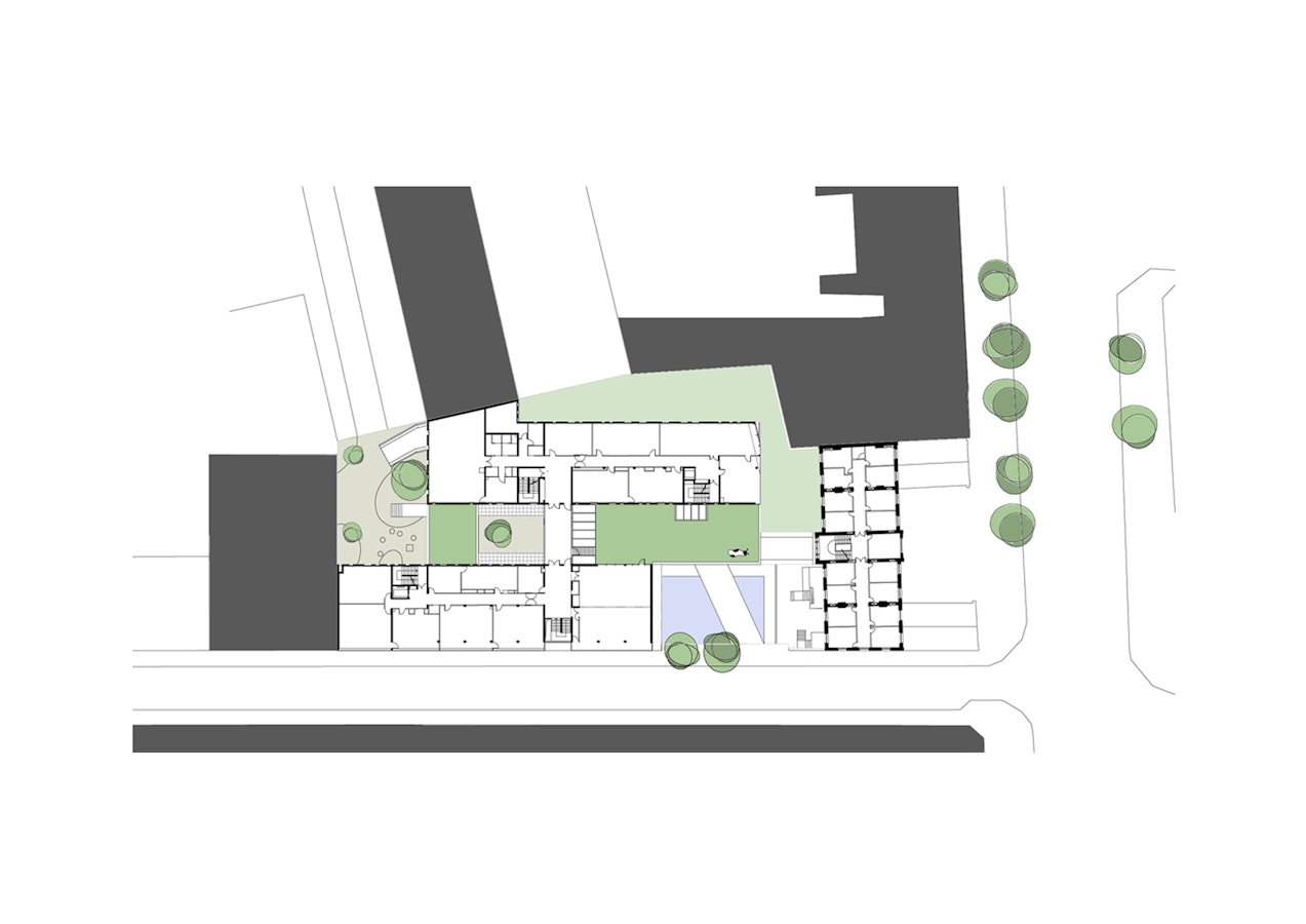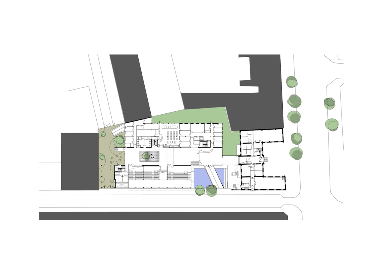 Lieu ouvert et transparent, le bâtiment apparaît autour d’une «scène de théâtre», visible depuis le boulevard Vauban, où conversent avec lui les bâtiments Néogothiques «Historiques» de la Catho autour du nouveau jardin d’eau que franchit la passerelle d’accueil.