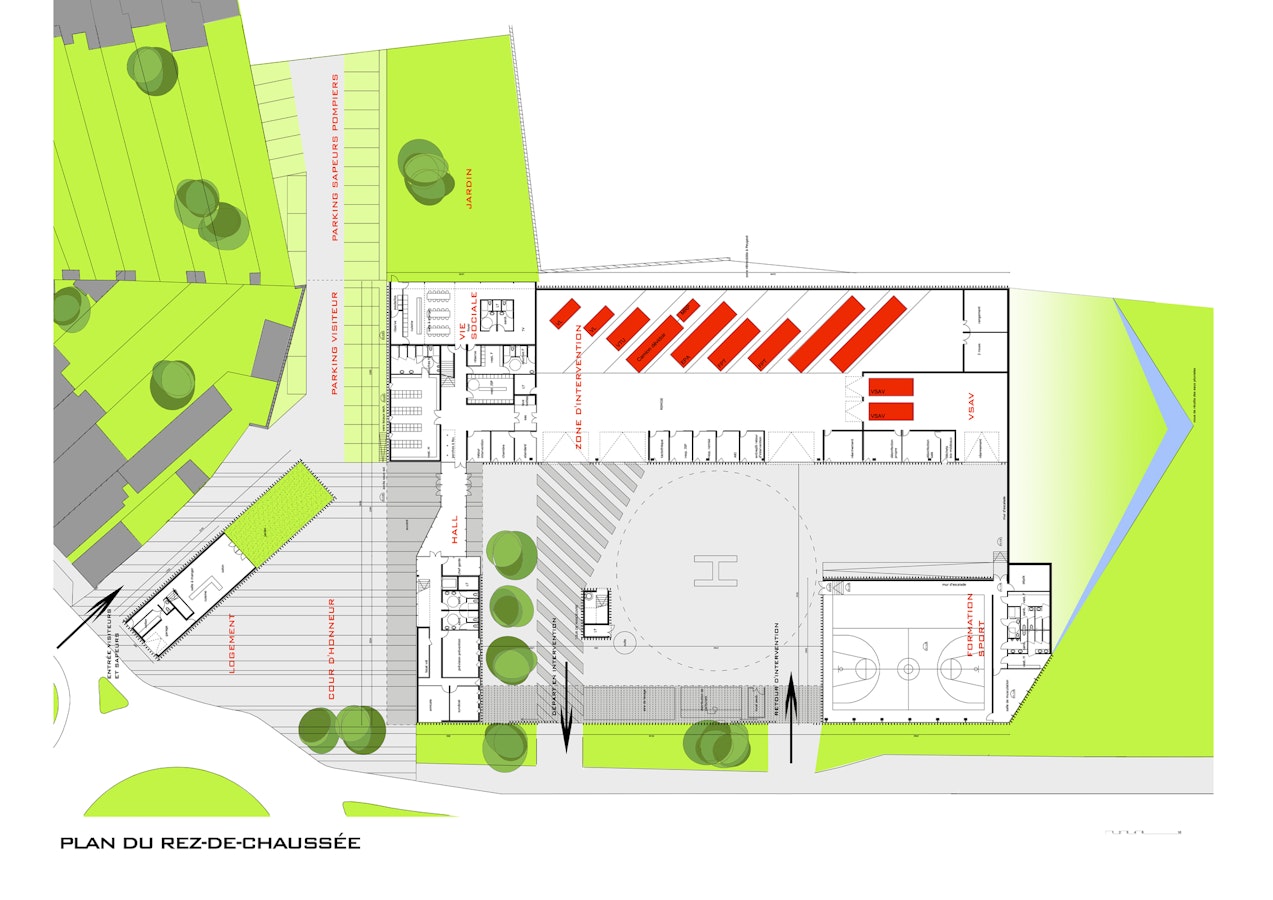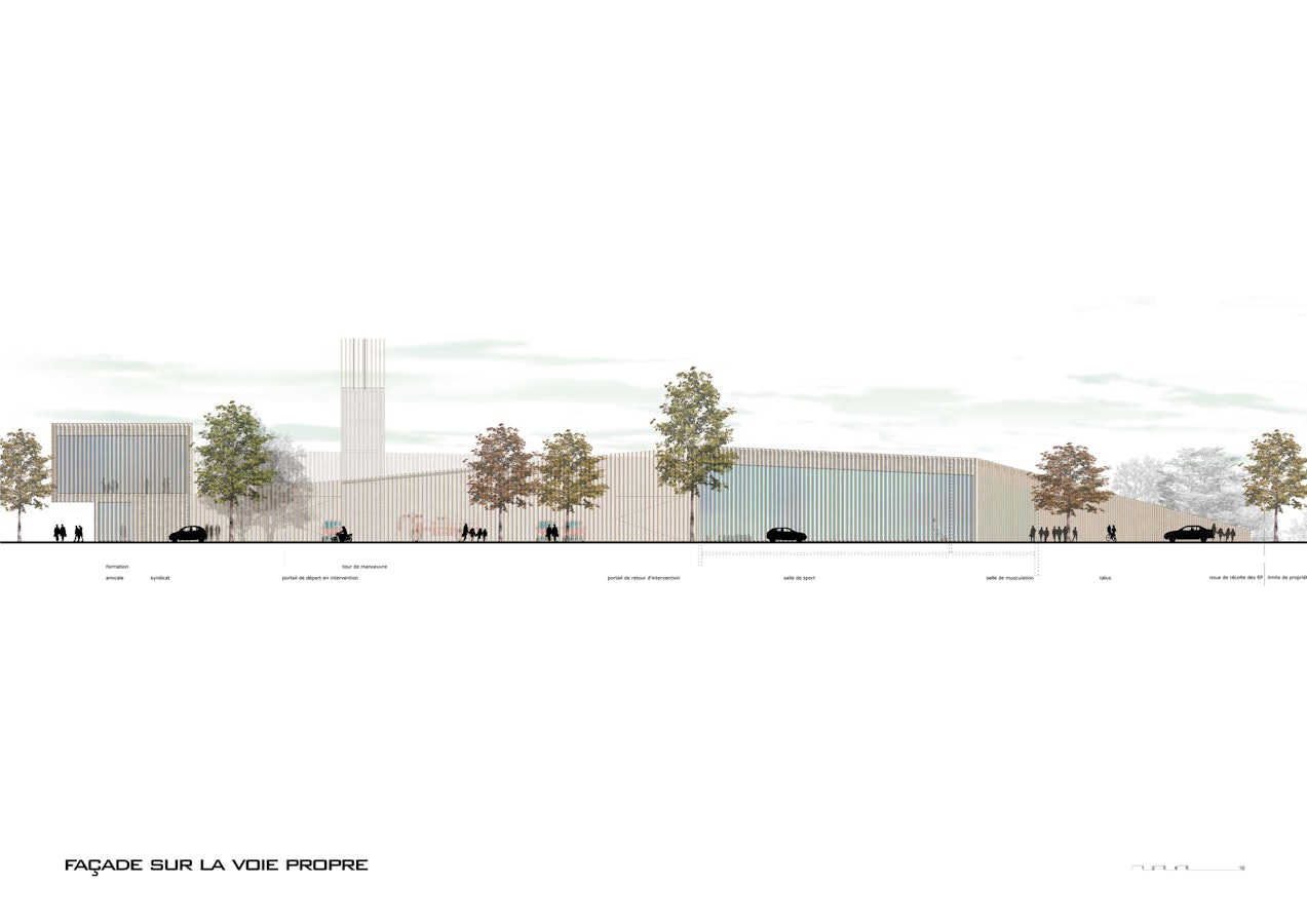 L'édifice présente une image unitaire, contemporaine, où s’équilibrent des rapports variés entre transparences et opacités. Le projet ménage l’intimité d'une cour de manœuvre protégée. Il offre la transparence d’un édifice public, synonyme d’accueil et de convivialité, tout en assurant l’isolement d’espaces sécurisés. Traitée comme une grande pièce à ciel ouvert", la cour structure et hiérarchise les lieux.