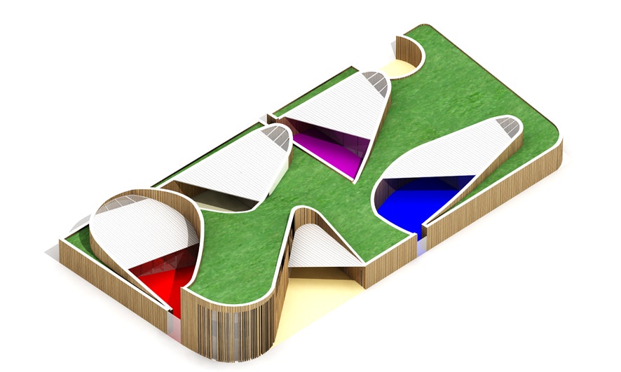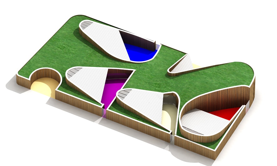 Les buttes de terres environnantes sont redressées et géométrisées à l’image de la toiture du bâtiment, Avec cette toiture, les façades constituées de peaux de zinc noir se plient et se déplient, traduisant le trouble qui existe ici entre paysage et architecture.
