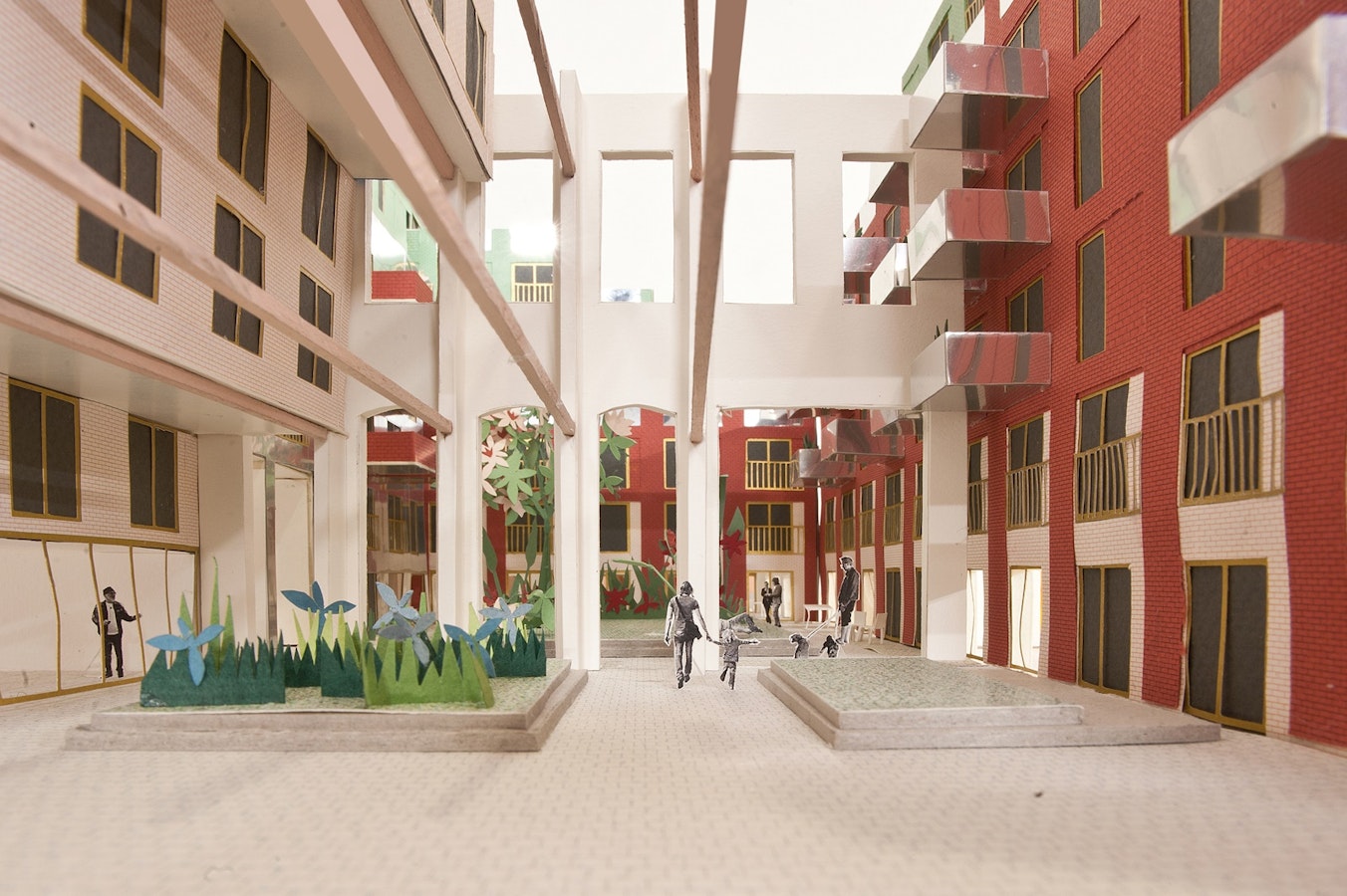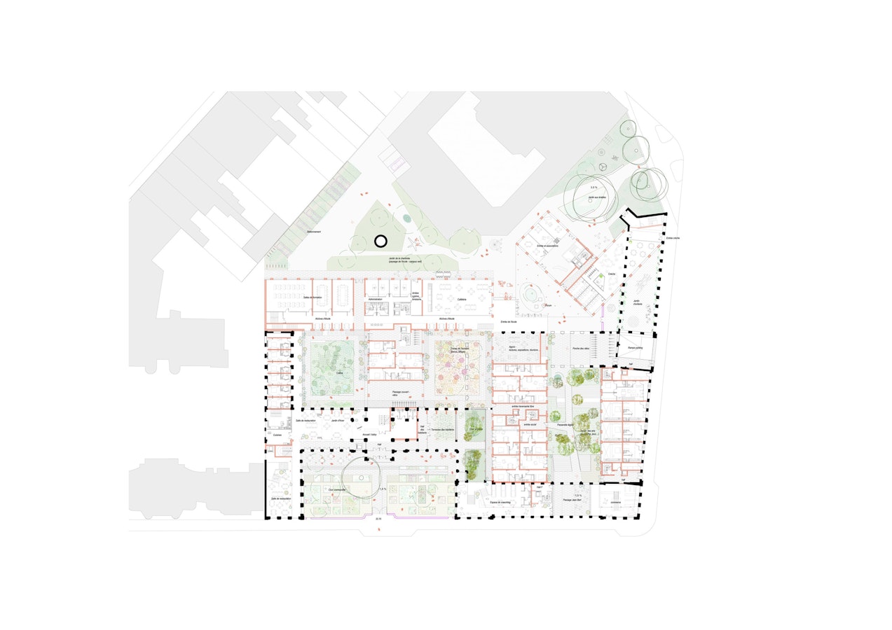 Cours et jardins; et des variantes parmi tant d’autres, tant d’autres variantes parmi elles; mais l’idée de la cour et du jardin fait que ces espaces libres entre les bâtiments pourront chacun trouver leur identité. Non seulement par leurs emplacements ou leurs orientations mais aussi par l’expression singulière que pourront avoir ces espaces libres.