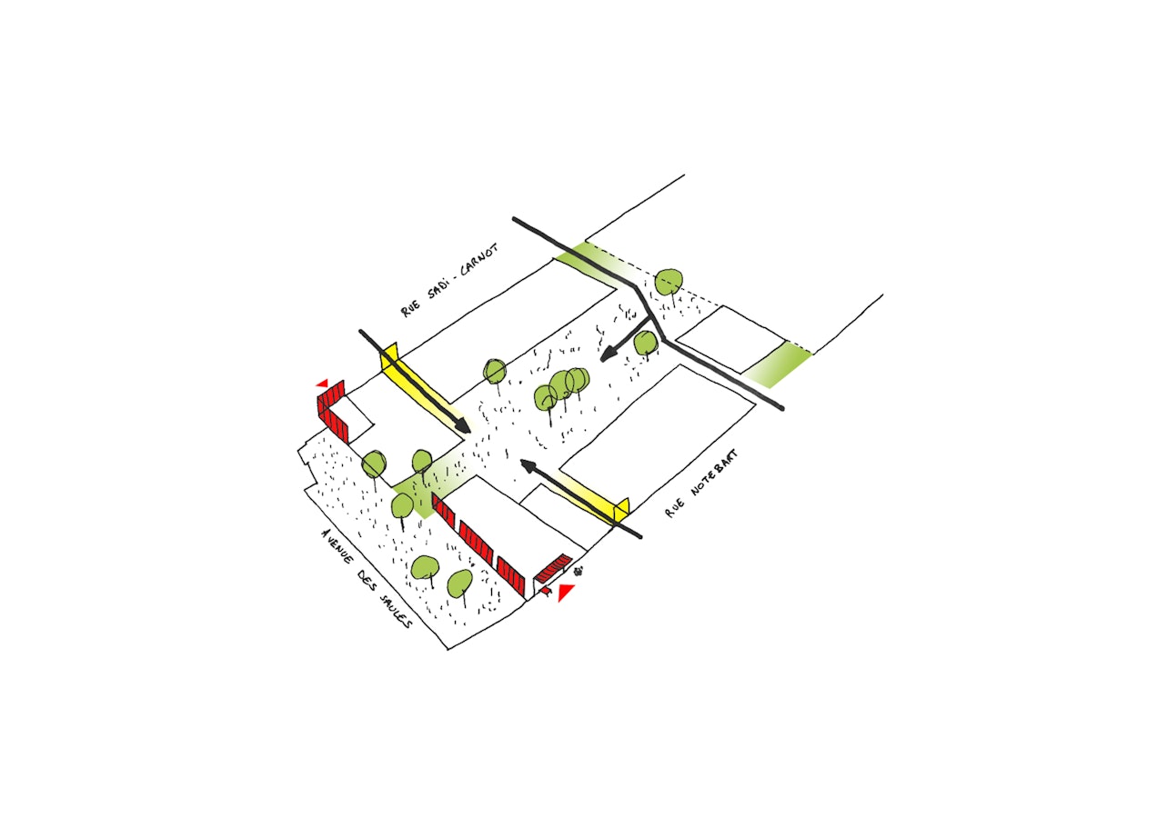 L’écriture architecturale et les gabarits du projet s’inscrivent à la fois dans la continuité du tissu existant et initient les opérations voisines futures. Le projet introduit le changement d’échelle, de l’individuel au collectif, en proposant à la fois une réinterprétation des rangs de maisons traditionnels sur les rues Notebart et Sadi Carnot et une hybridation de cette typologie sur l’avenue des Saules.