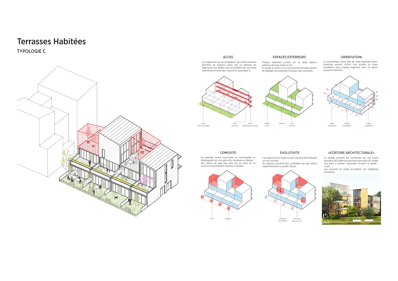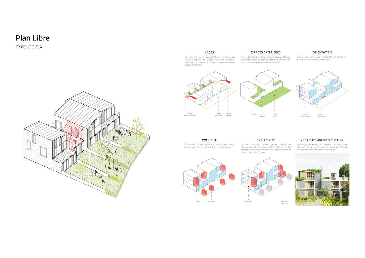 Le vivant, c’est à la fois ce milieu de nature et de culture, de paysage et d’architecture et ses habitants qui vont se l’approprier et le conformer avec le temps par leurs usages, les interactions de leurs vies. C’est une continuité douce mêlant nature et culture, pierre et végétal à laquelle ce lieu de « Plaisance » aspire, et non la frontalité d’une forme figée. C’est un étirement des qualités de l’écologie et de la géographie remarquables des prairies Saint Martin jusqu’à l’intimité du logement. C’est aussi un étirement des qualités humaines et esthétiques des joyeuses maisons ouvrières du bord du canal et leur plaisir d’habiter, non sa colonisation par l’urbain rigide. Un quartier à échelle humaine, à « dimension humaine », celle qui accepte la complexité des interactions, et non les gestes esthétiques isolés des architectes. Ce sont des assemblages complexes de typologies simples et évolutives, afin de donner un grain à la ville et une possibilité d’altérations, d’extensions, véritables appropriation de ses habitants dans le bâti. Et donner le plus possible de terre pour cultiver, planter.