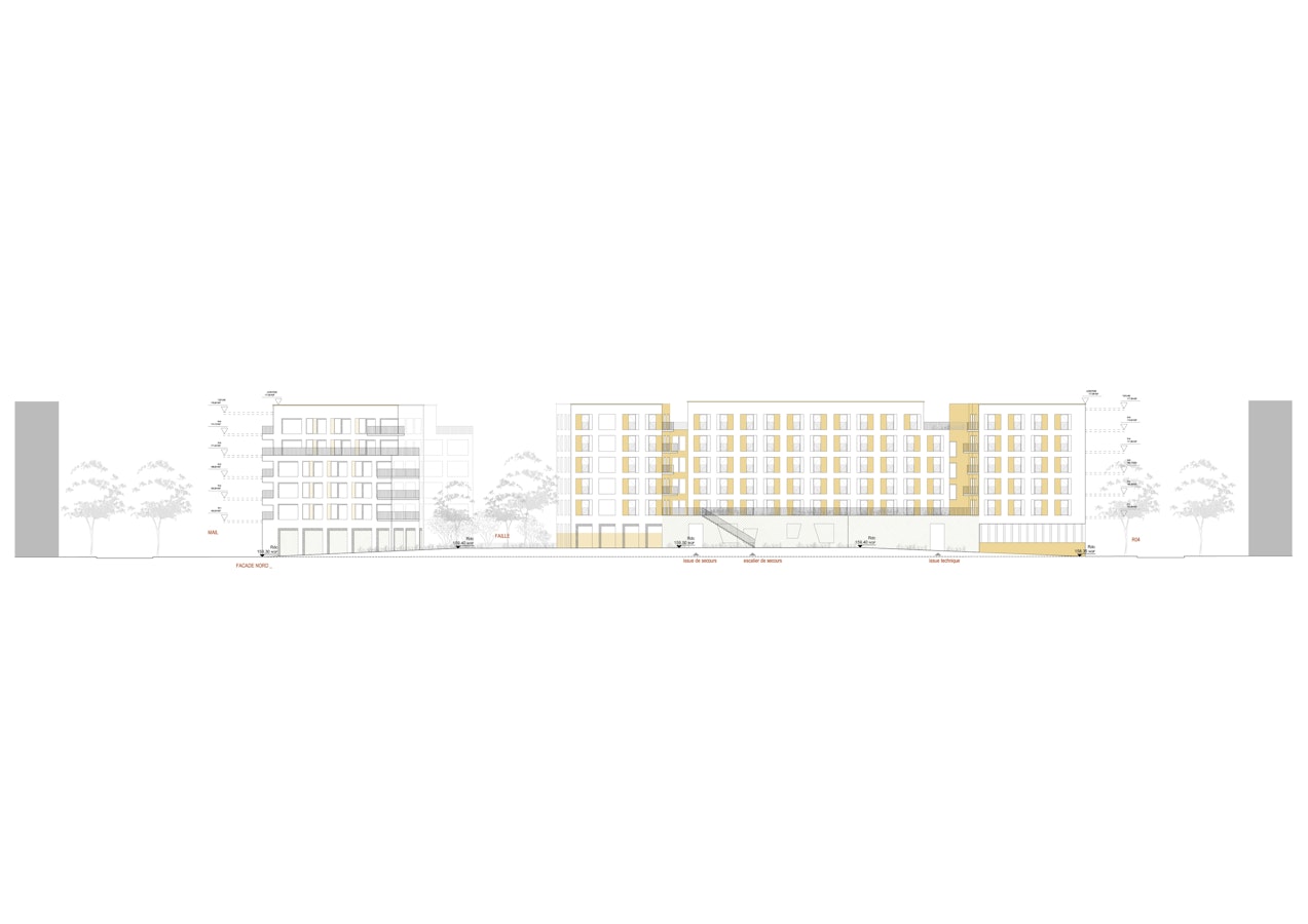 Nous saisissons toutes les opportunités qu’offrent le site (légère topographie) et le plan (salons partages que nous disposons en façades) pour fragmenter, subdiviser la grande longueur de la façade sud. Ceci, au profit d’un dessin à échelle humaine. Nous voulons éviter l’écueil du "grain trop gros" qui sied plus aux institutions d’enseignement qu’aux opérations de logements. Les grains plus fins que nous créons correspondent à la ville que nous aimons, faite de rythmes et de scansions verticales. Alternative à la monotonie qu’engendrerait une façade longue et unitaire, nous mettons en place ce principe en combinant urbanité homogène et architecture variée, a l’image de la mixité qu’intègre tout quartier, fait de collectif et d’individualités.