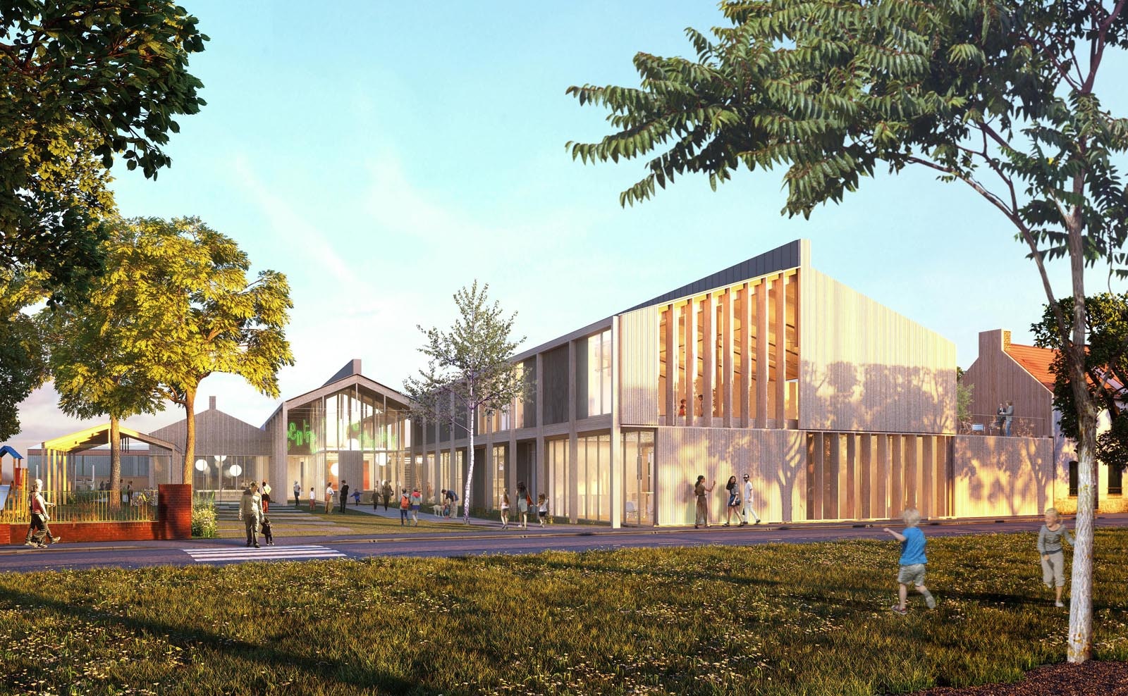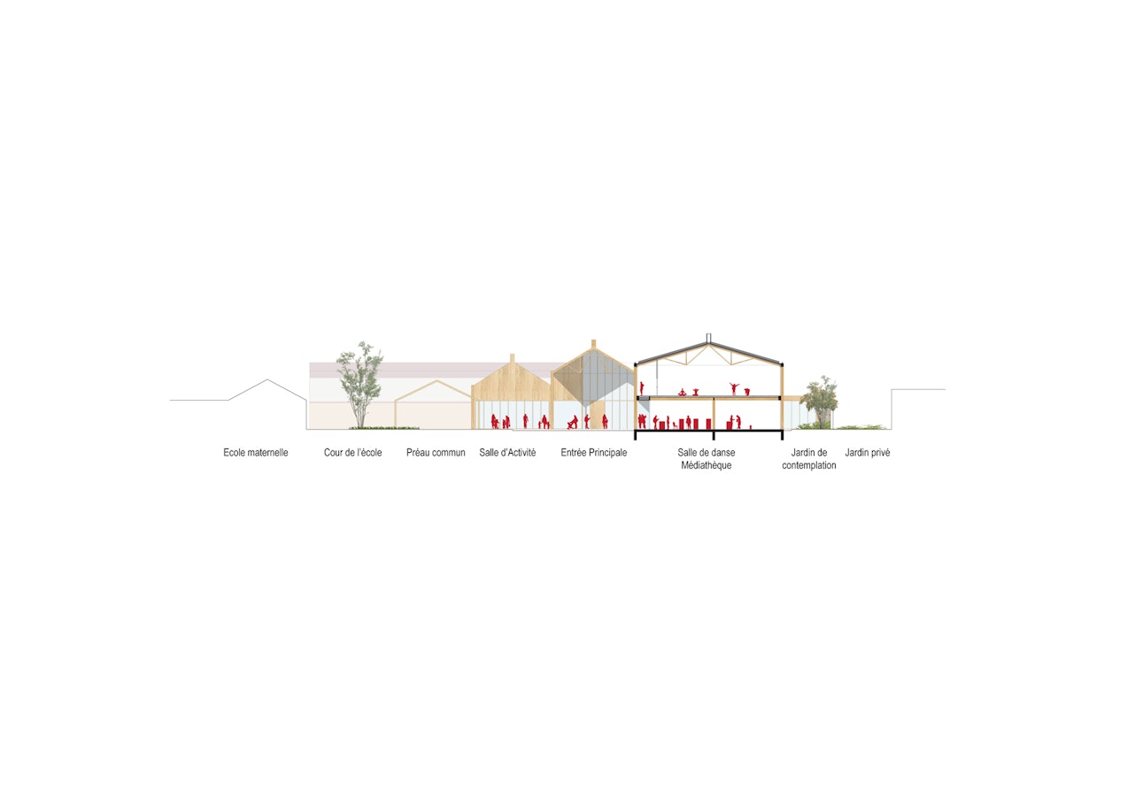 Le projet est délibérément contemporain, mais d’une modernité inscrite et respectueuse des lieux : il fait écho aux constructions traditionnelles, aux “toitures en pentes” de l’école, du gymnase et des maisons voisines.