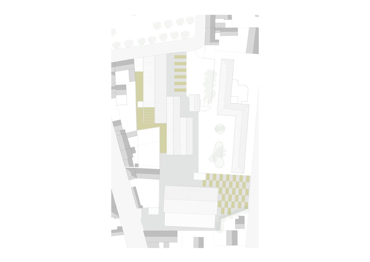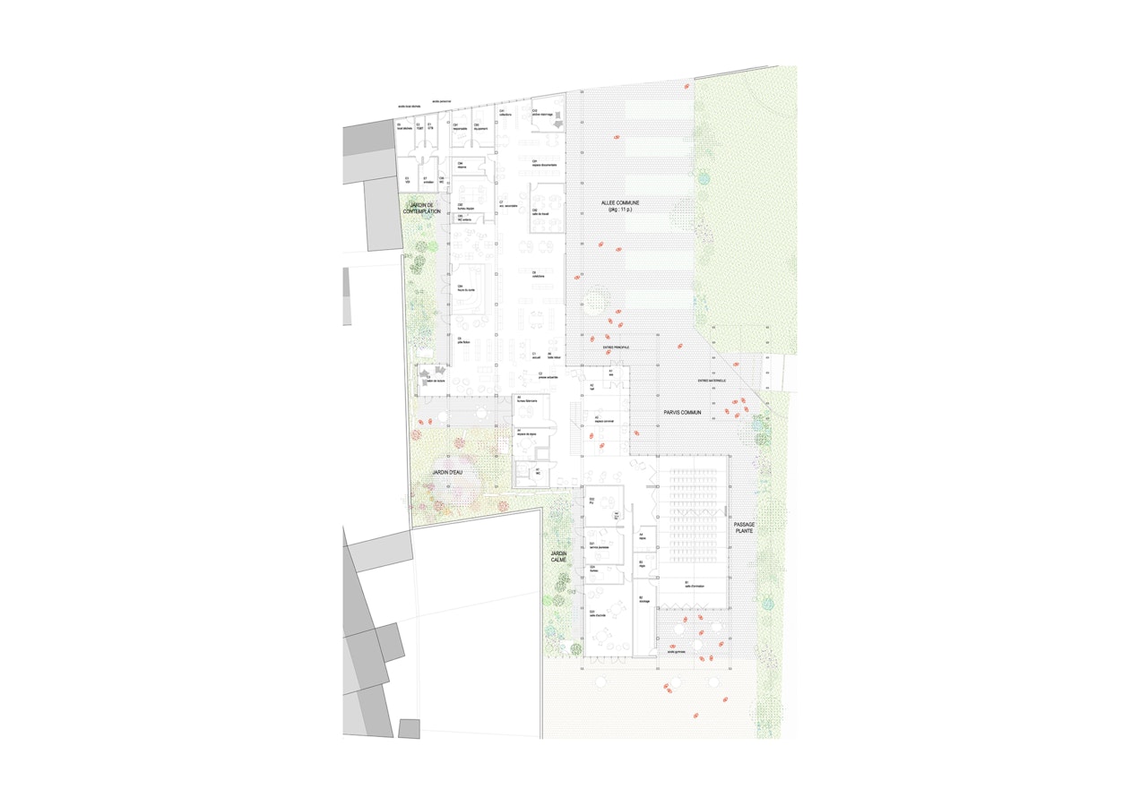 Cet auvent manifeste le caractère public et institutionnel de l’équipement. La création du parvis, du passage piétons, d’une nouvelle placette en cœur d’ilot ménage une nouvelle promenade urbaine. Tandis que les jardins installent des liens visuels, des prolongements extérieurs, une intimité paysagère.