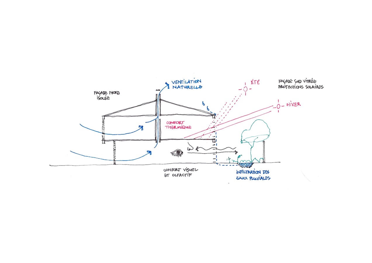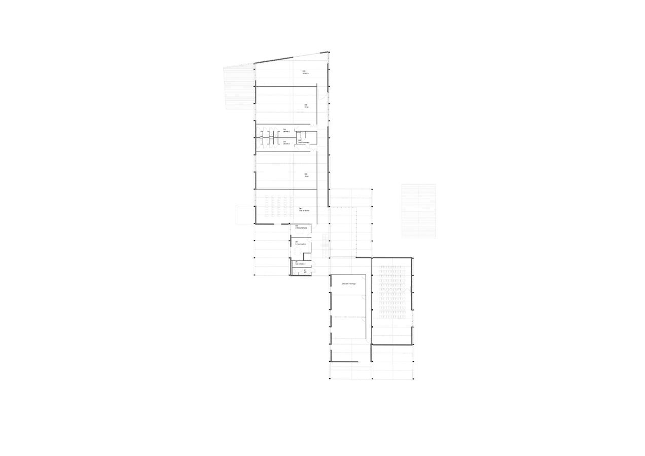 La forme est issue d’une rationalité fonctionnelle dans un cadre expressif. Elle combine une figure “stable” et simple en plan – une succession d’espaces rectangulaires très facilement appropriables - et une toiture constituée de pans inclinés. L’ensemble est rationnel, compact, fonctionnel, économiquement viable.
