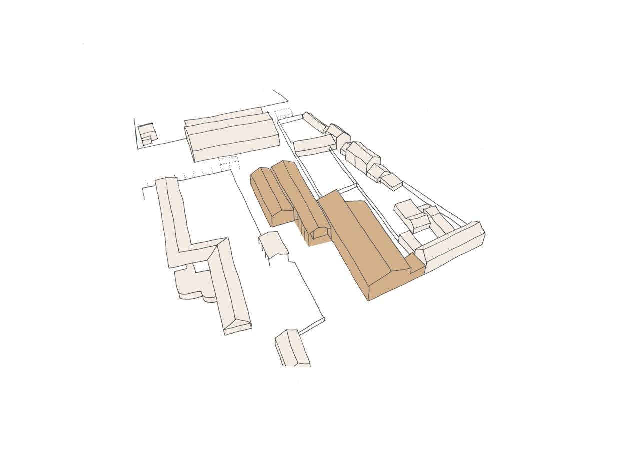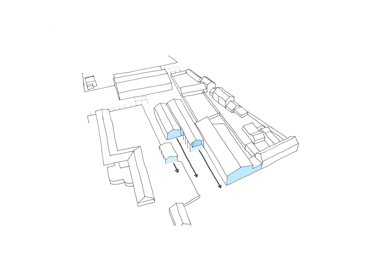 Intimement mêlées à cet îlot reconfiguré, les formes sont simples. L’esthétique est réglée par une combinaison de « halles » disponibles. Suivant que l’on se place devant l’une des façades, on saisit le système régulateur, on comprend qu’il s’applique à l’ensemble de l’édifice.