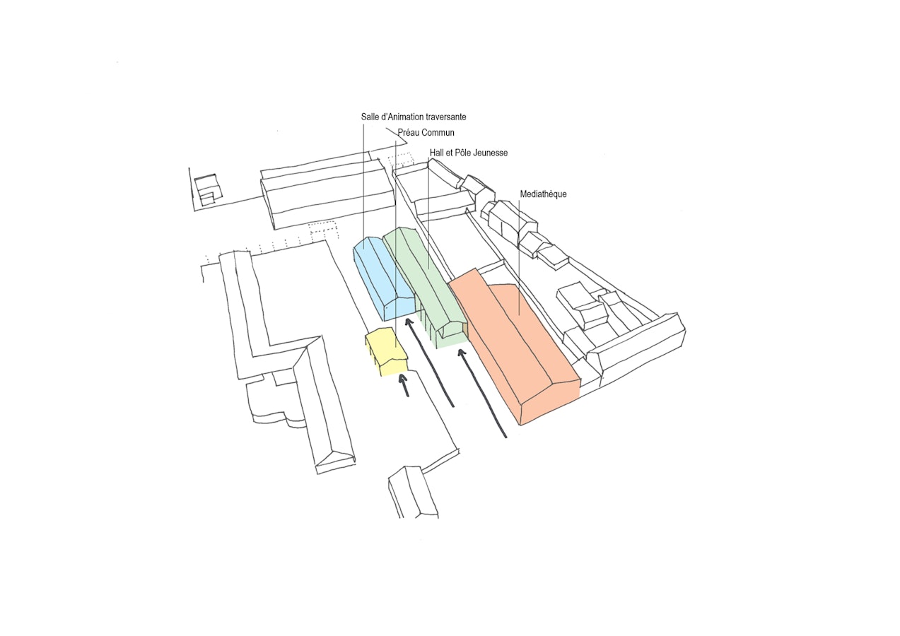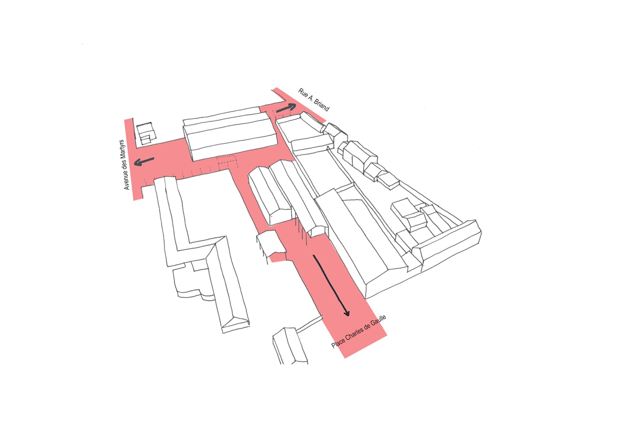 Le pôle culturel ménage de nouvelles liaisons piétonnes, douces et transversales. Le projet ne s’impose pas par sa masse ; il est un évènement urbain. Il relie les avenues du quartier, ménage toute une série d’espaces publics : le parvis, le passage public, la placette et les jardins.