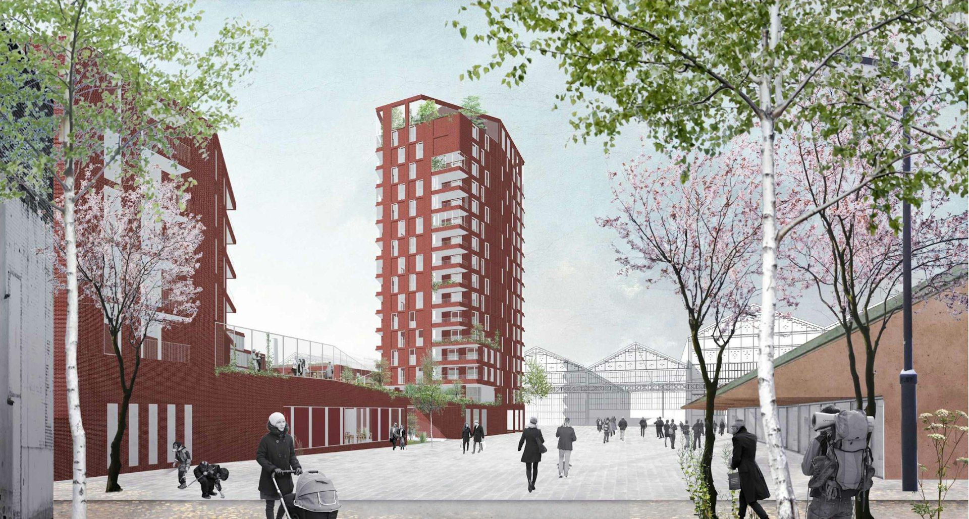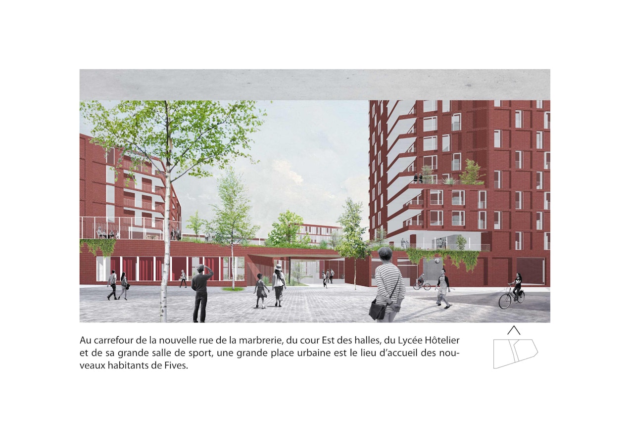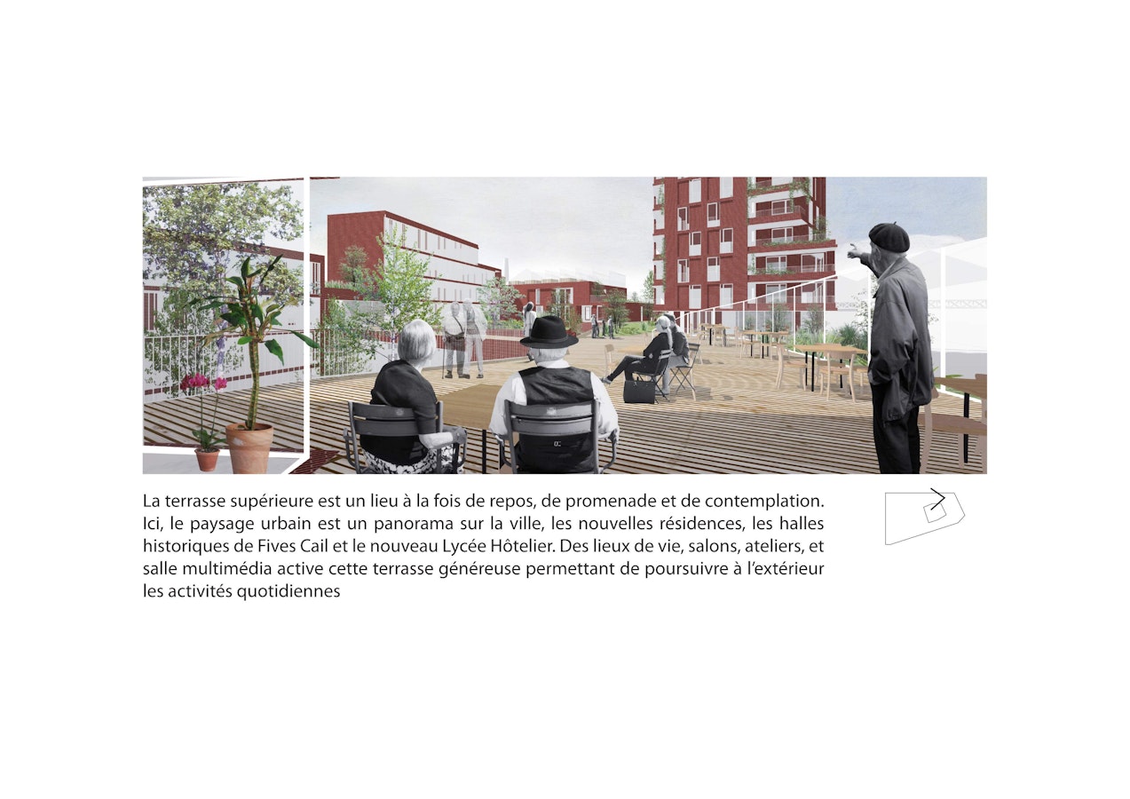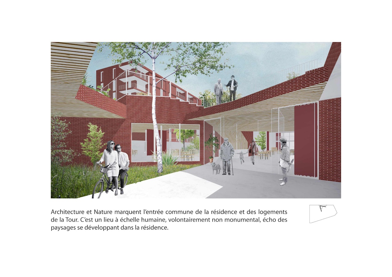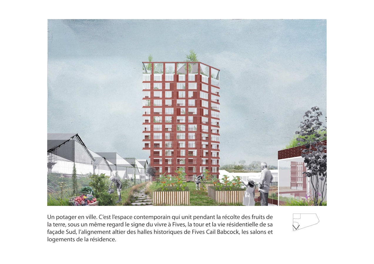 Ici, nous concevons une résidence Seniors « négociatrice et écosystémique », accueillante, protectrice, à la fois intime et ouverte à l’image d’un « béguinage contemporain ». Nous affirmons le signe fort du renouveau de Fives-Cail-Babcock incarné par la Tour « marqueur », présente mais non surdéterminante.