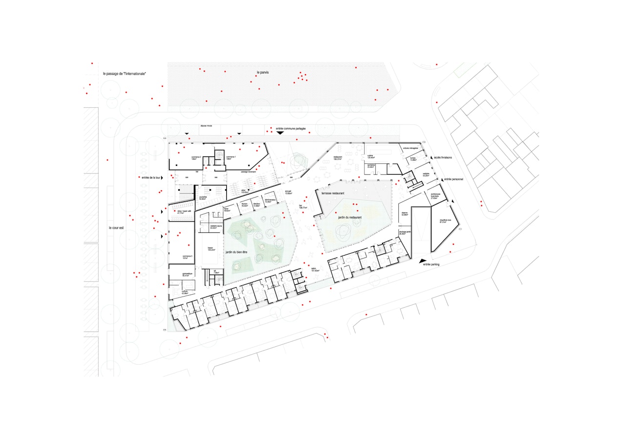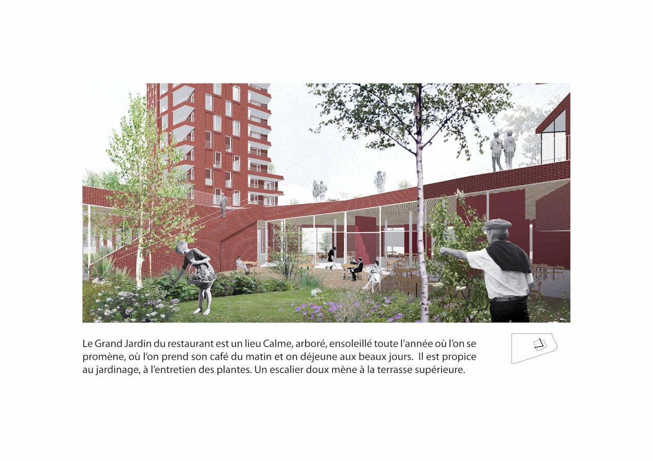Un premier jardin, commun partagé, pleine terre est ouvert à tous les habitants de l’îlot. Le hall d’accueil, le bar et le restaurant en prise sur la ville, ouvrent sur ce jardin également relié au jardin supérieur « en balcon » sur la ville via les escaliers, les ascenseurs, et différents salons. Les résidents de la tour et les Seniors s’y rendent très facilement, naturellement.