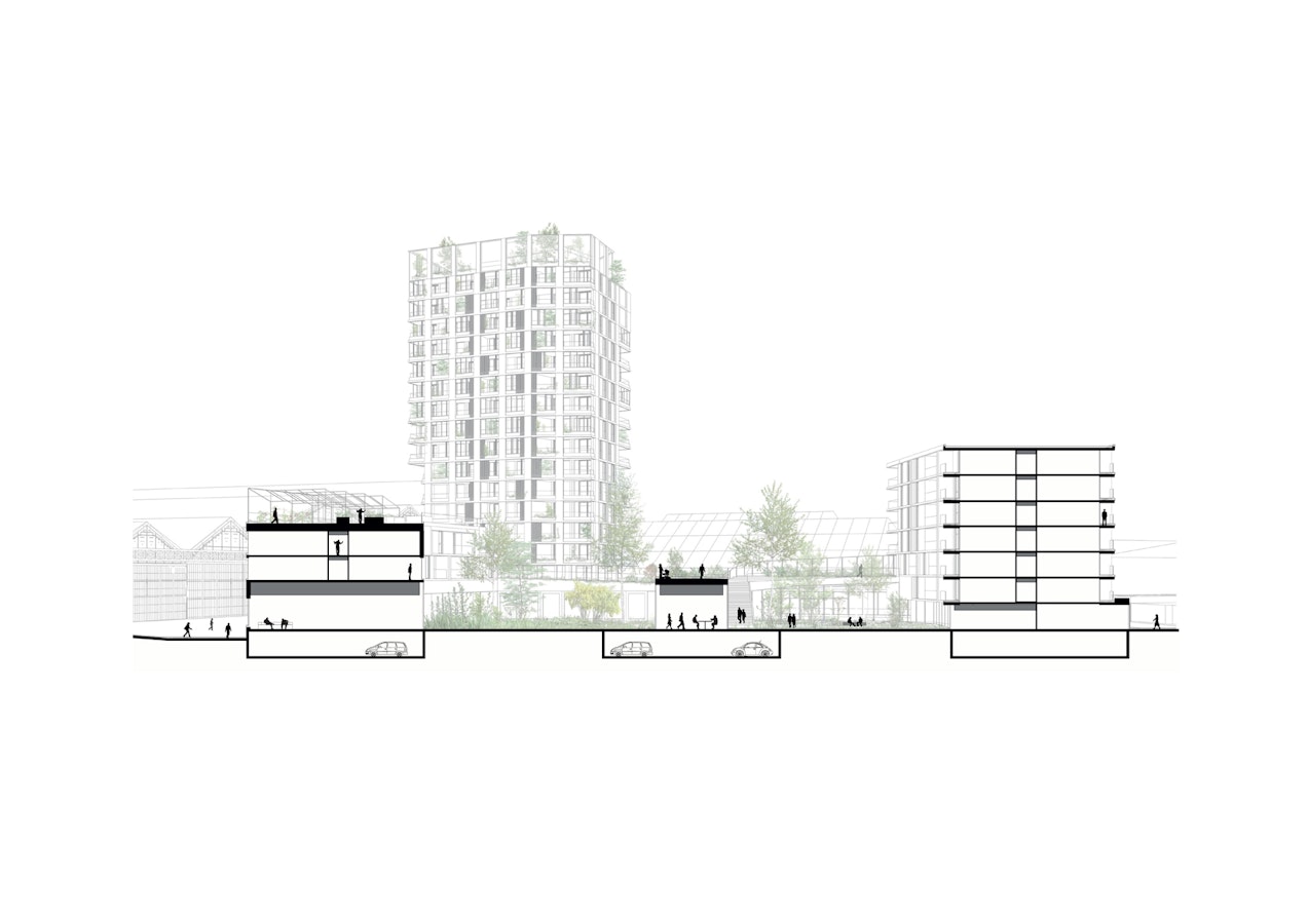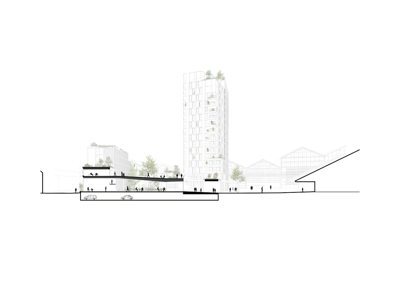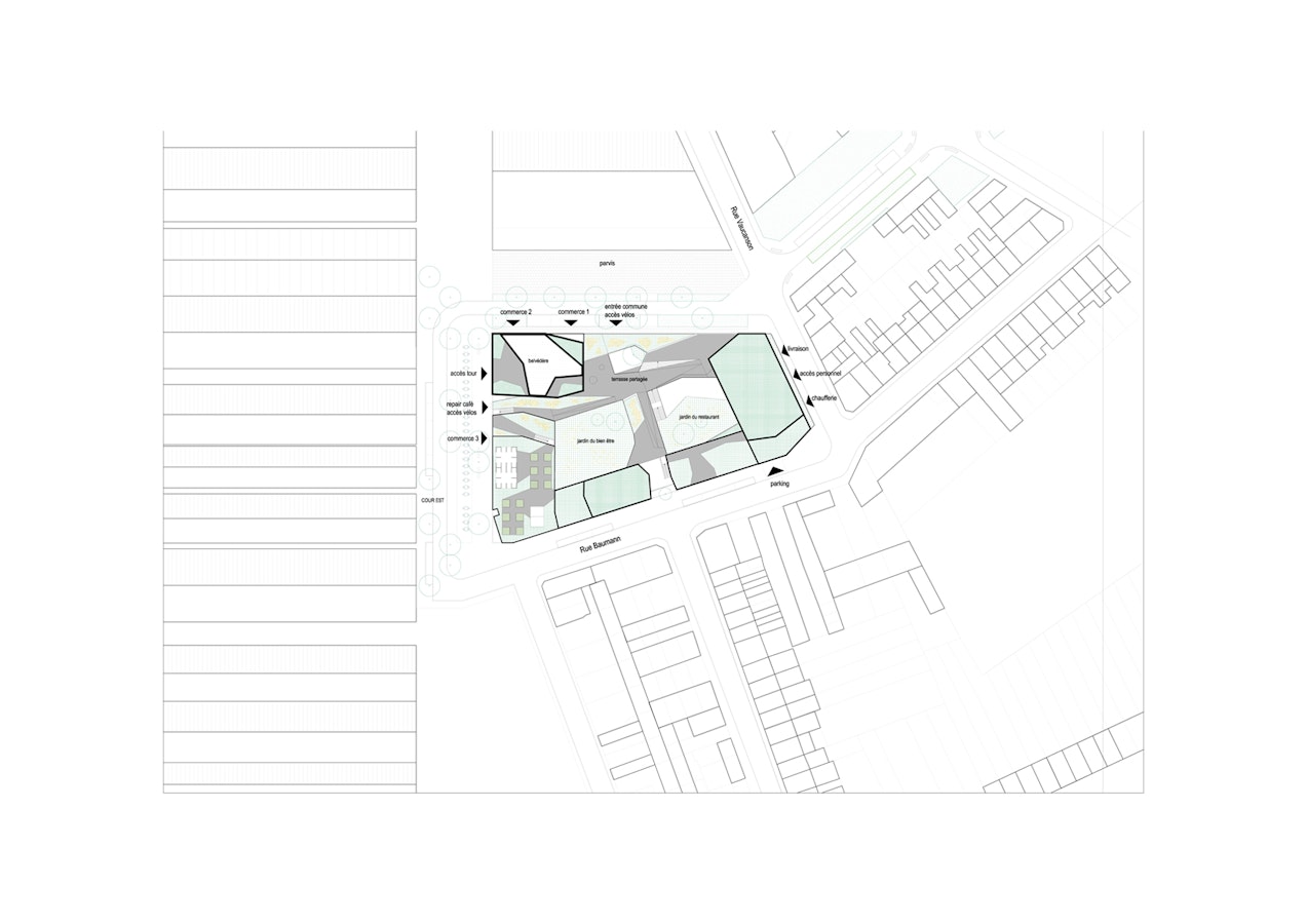 lutôt qu’une porosité visuelle non bâtie, nous proposons d’habiter, en transparence, la « traverse visuelle » qui se déploie du parvis du lycée jusqu’à la rue Dupleix, dans l’axe de celle-ci. Ainsi, nous exprimons la profondeur spatiale des lieux à travers la belle séquence d’entrée suivante: le « vestibule patio extérieur », puis le hall d’accueil, le bar « invitant » entre les deux jardins et enfin le salon en double hauteur sur la rue Pierre Baumann, dans l’axe de la rue Dupleix. Cette dynamique crée à la fois du lien et des usages, le projet et le quartier.