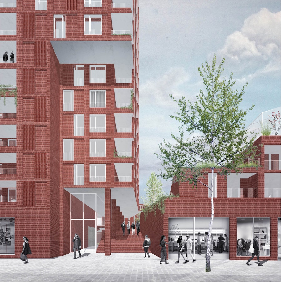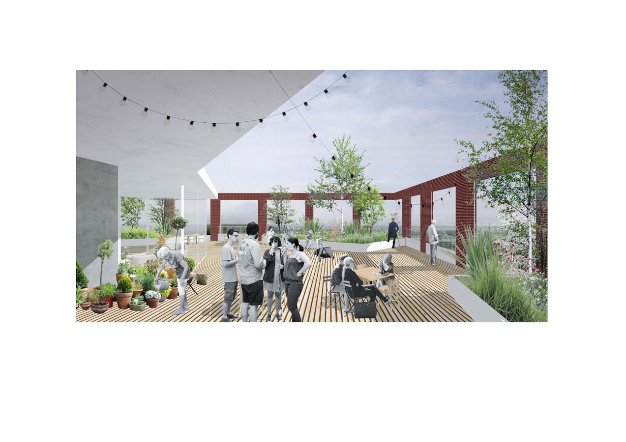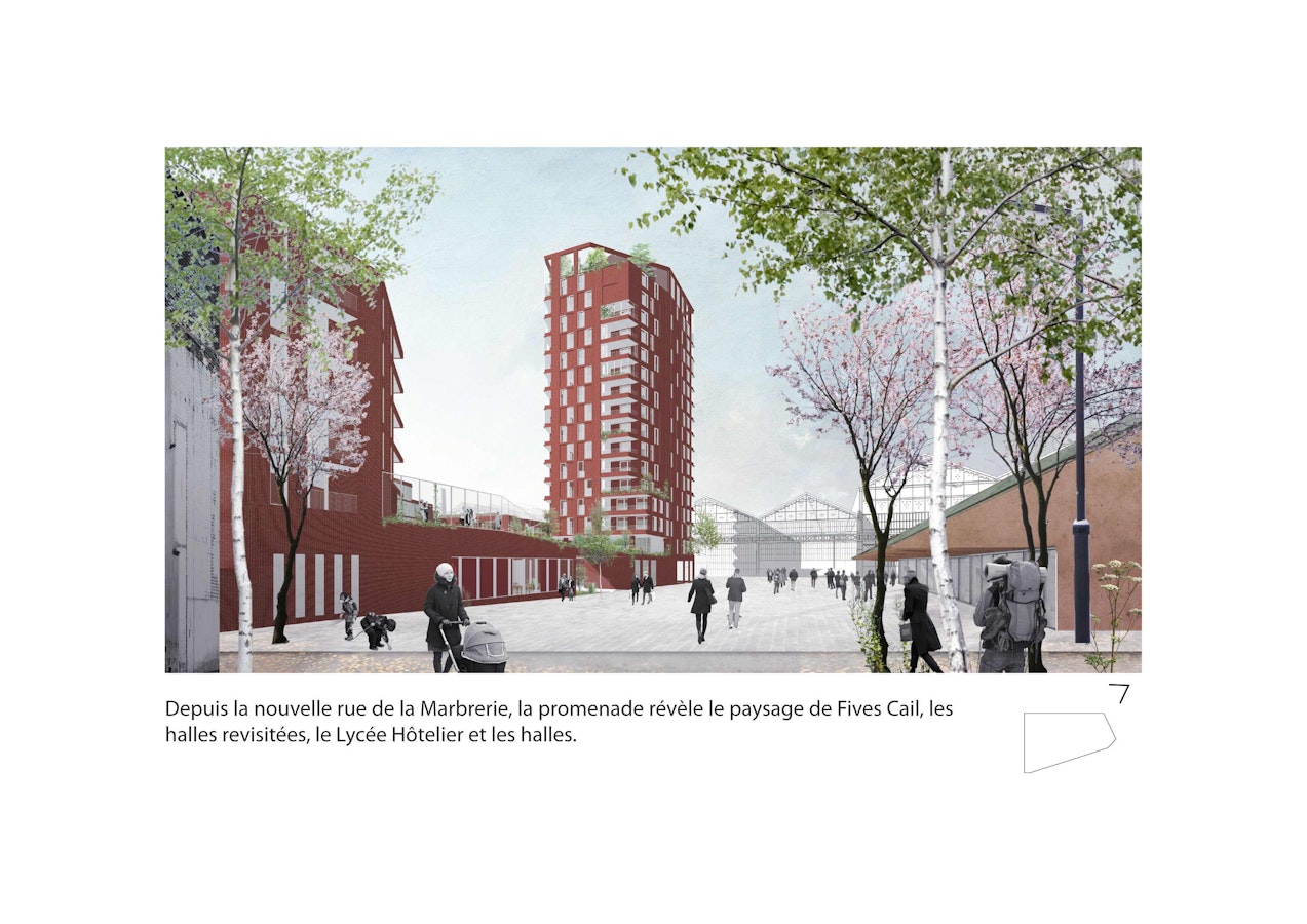 lutôt qu’une porosité visuelle non bâtie, nous proposons d’habiter, en transparence, la « traverse visuelle » qui se déploie du parvis du lycée jusqu’à la rue Dupleix, dans l’axe de celle-ci. Ainsi, nous exprimons la profondeur spatiale des lieux à travers la belle séquence d’entrée suivante: le « vestibule patio extérieur », puis le hall d’accueil, le bar « invitant » entre les deux jardins et enfin le salon en double hauteur sur la rue Pierre Baumann, dans l’axe de la rue Dupleix. Cette dynamique crée à la fois du lien et des usages, le projet et le quartier.