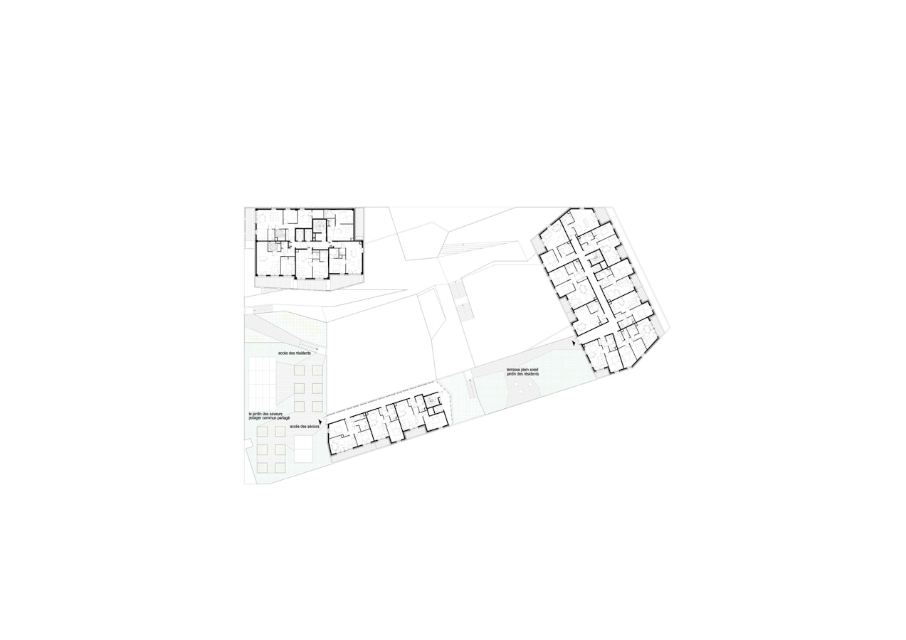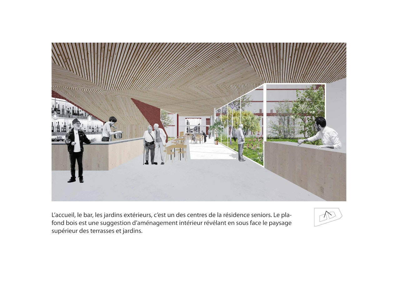 Les résidents de la tour peuvent se rendre dans 3 des 4 jardins de la résidence seniors et accueillir les seniors dans leur bibliothèque commune au r+1 et au sein de la cuisine collective, sa terrasse protégée et son jardin au sommet de la tour.