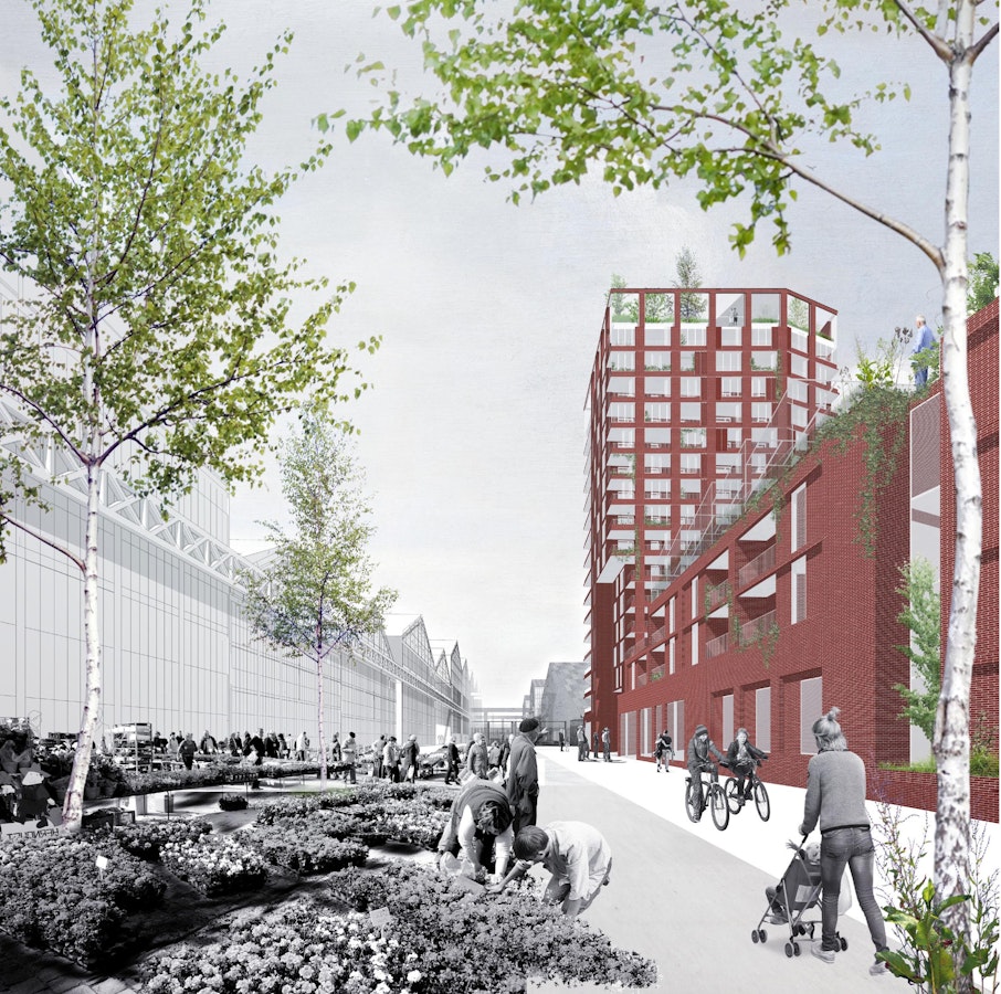 Nous imaginons dresser des « potagers en carrés » (dispositifs surélevés du sol, propices au confort d’usage et au réchauffement du substrat). Nos images suggèrent l’accueil éventuel d’une petite serre pour une production « toute saison » et le stockage des outils. Elle permettrait d’augmenter