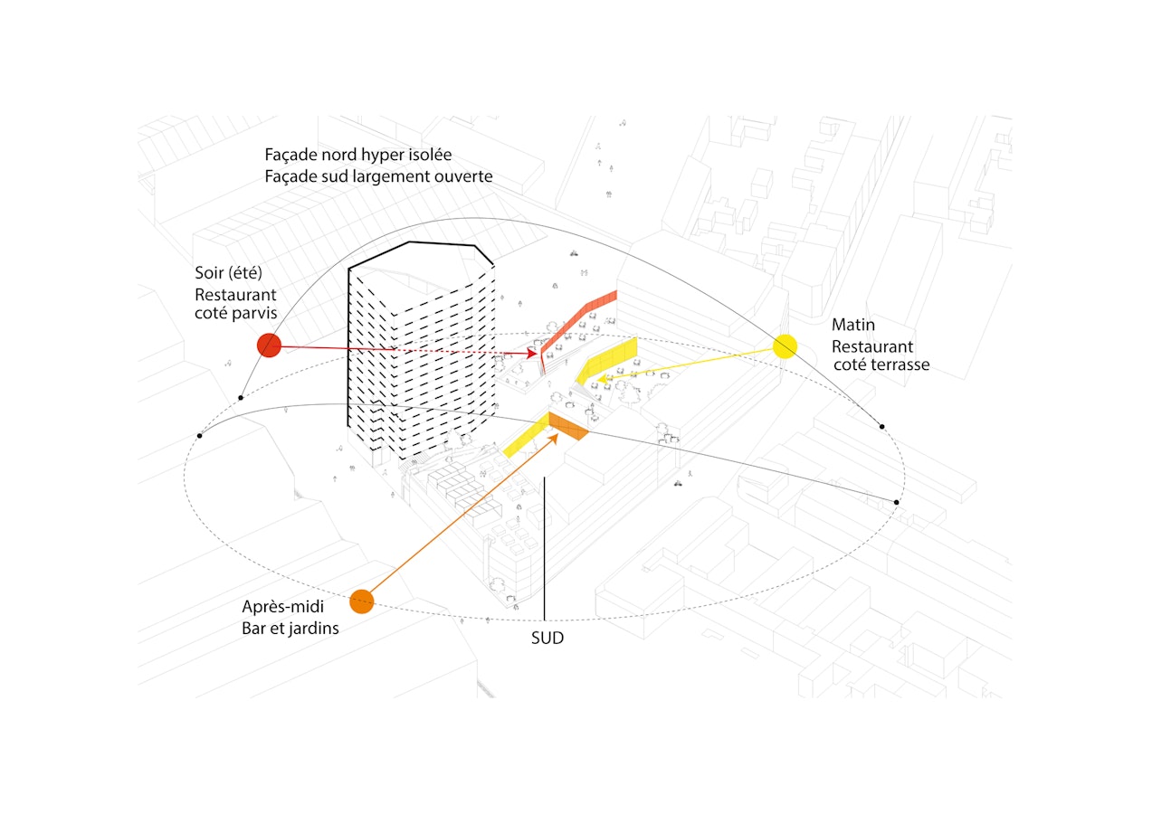 Les Jardins intérieurs et leurs programmes de vie, bar, salle de repos, restaurant, demandent de la lumière : prendre son petit déjeuner et son déjeuner au soleil dans le restaurant : dès le matin, puis le midi dans le jardin, et même au soir sur le parvis. Le bar est également est pleinement éclairé naturellement, tout comme les jardins.