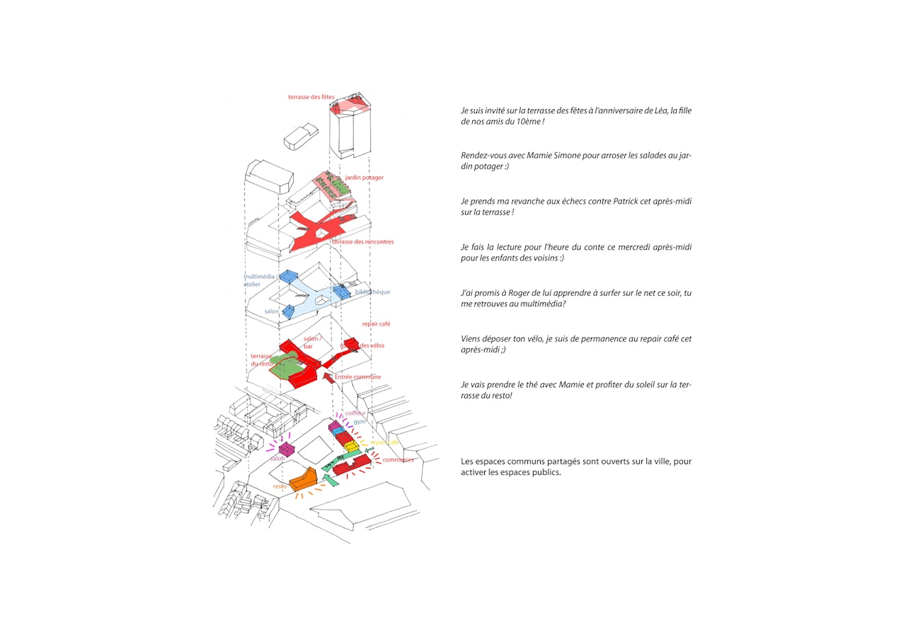 Les seniors peuvent se rendre facilement aux espaces partagés de la tour et peuvent accueillir des visiteurs et les habitants au sein du bar, du restaurant, et des 3 jardins précités : le jardin pleine terre au rez, le jardin en balcon sur la ville au r+1 et le jardin potager partagé en terrasse.