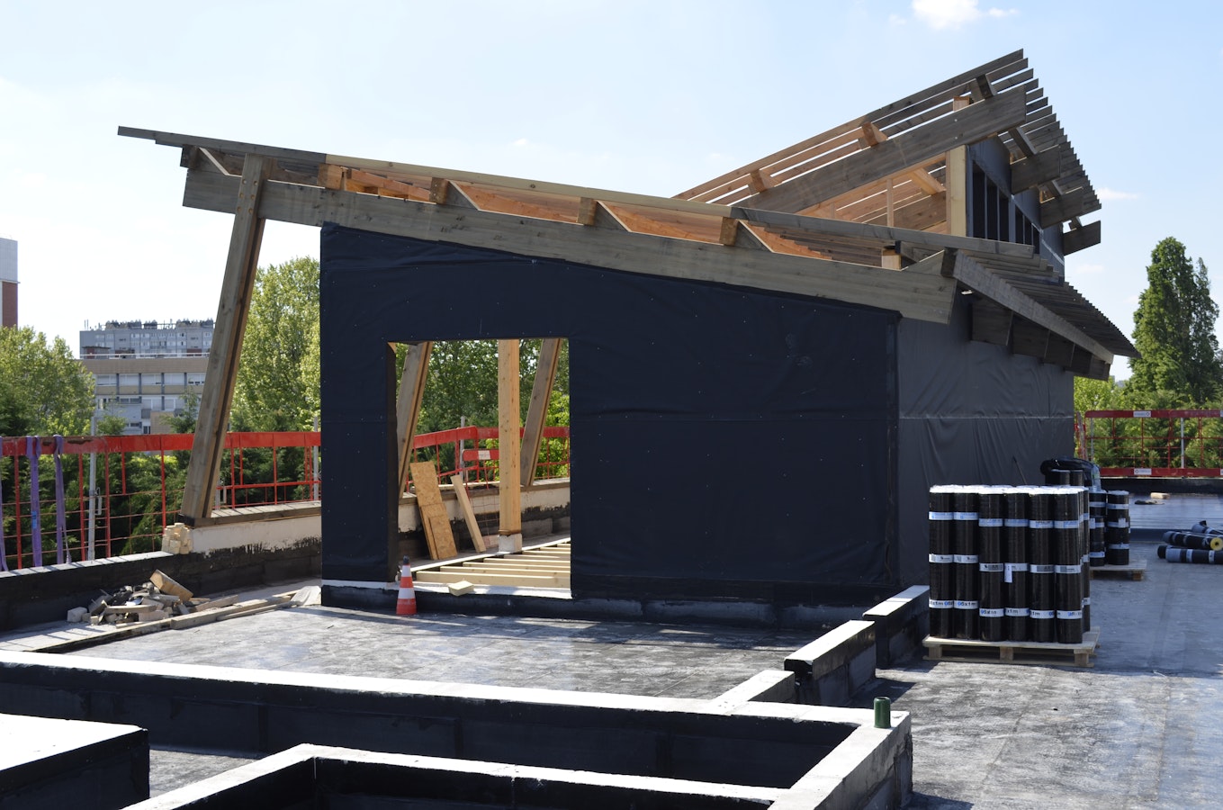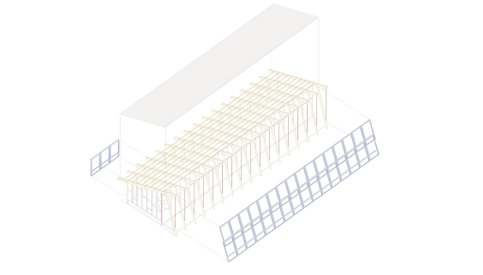 L’ossature bois, légère, compatible avec les surcharges acceptables en toiture, accueille les châssis vitrés existants, déposés, puis remontés pour constituer les façades de la serre et de l’espace tampon Sud.