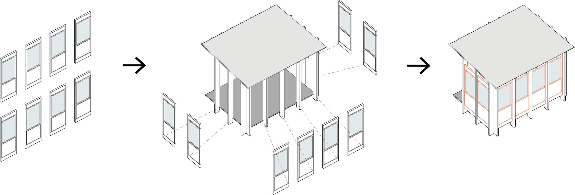 Le réemploi des châssis vitrés existants permet de créer des espaces en plus (la serre, le jardin d’hiver, le kiosque, ….).