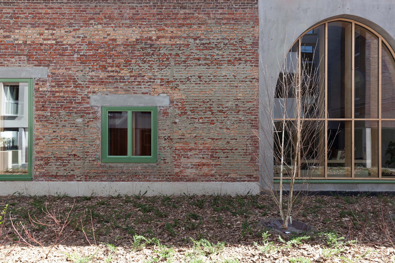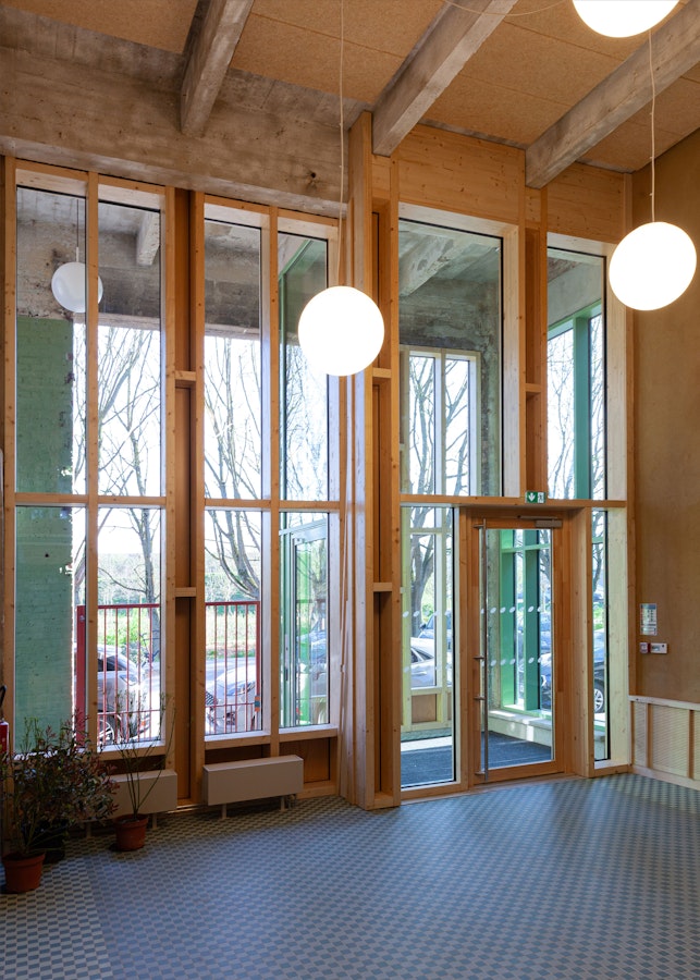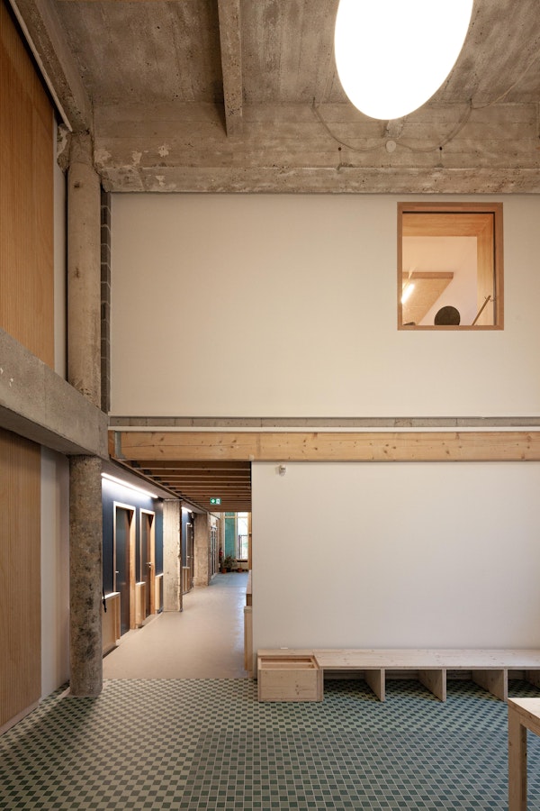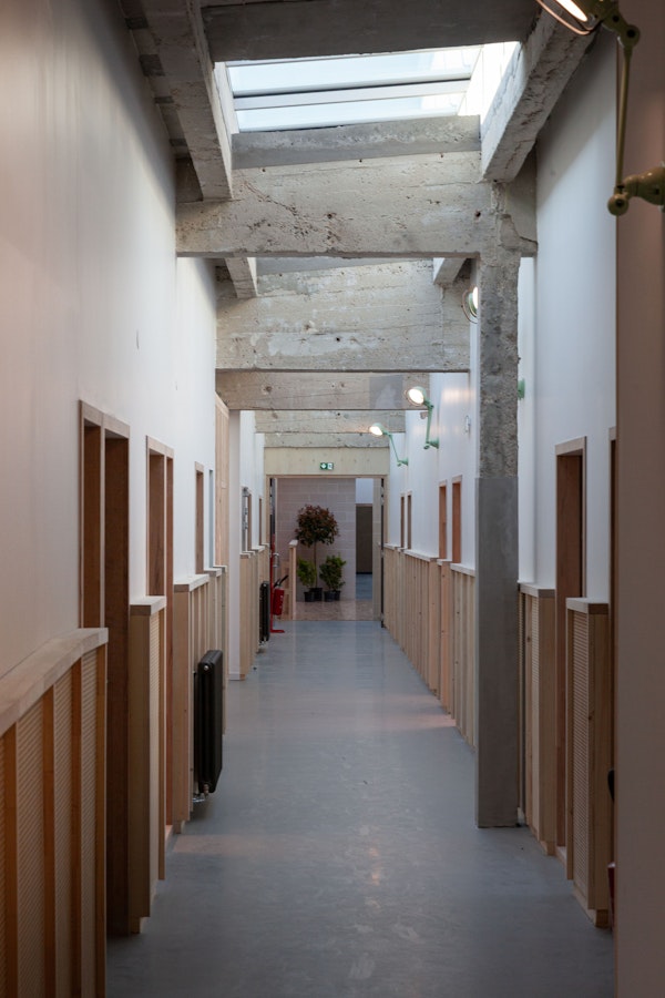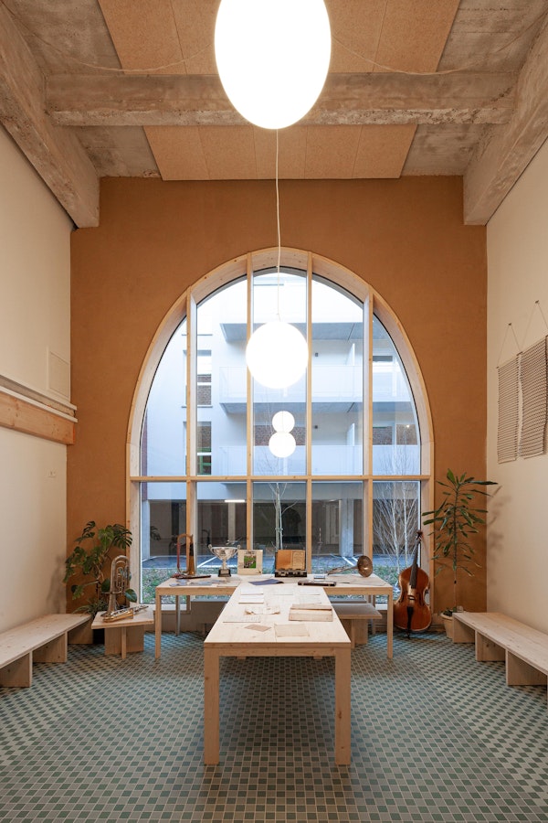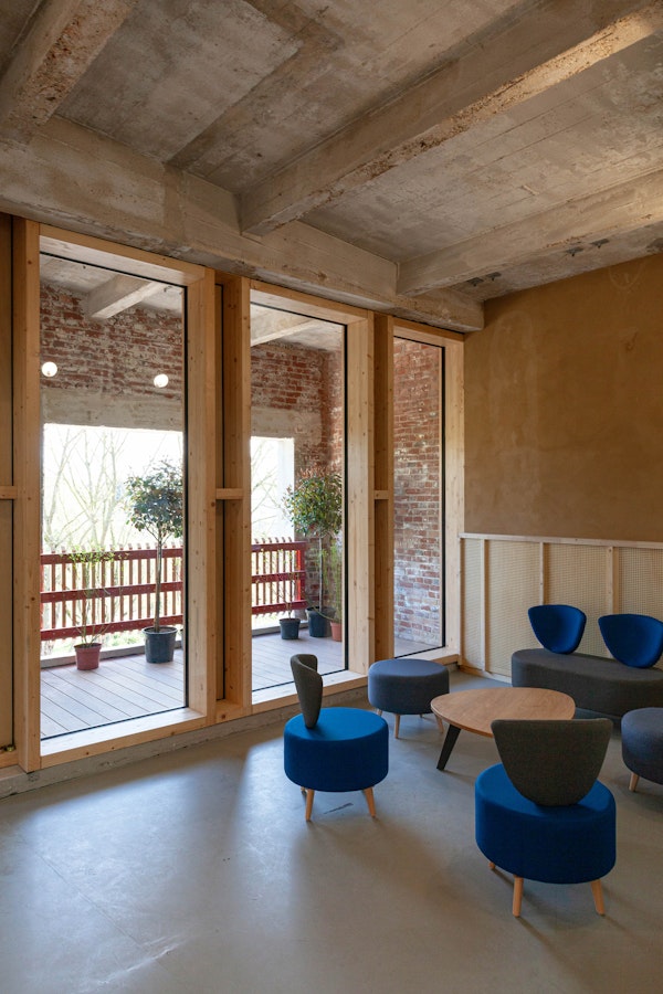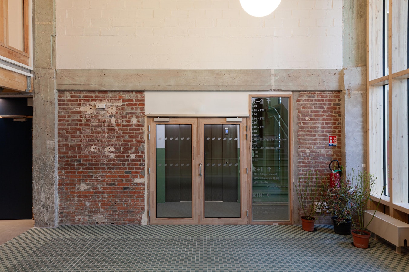 Les matériaux identitaires révélés Structure poteau-poutre, dallages béton, recouverts en partie acoustiquement, briques intérieures assainies révélées lorsque possible.